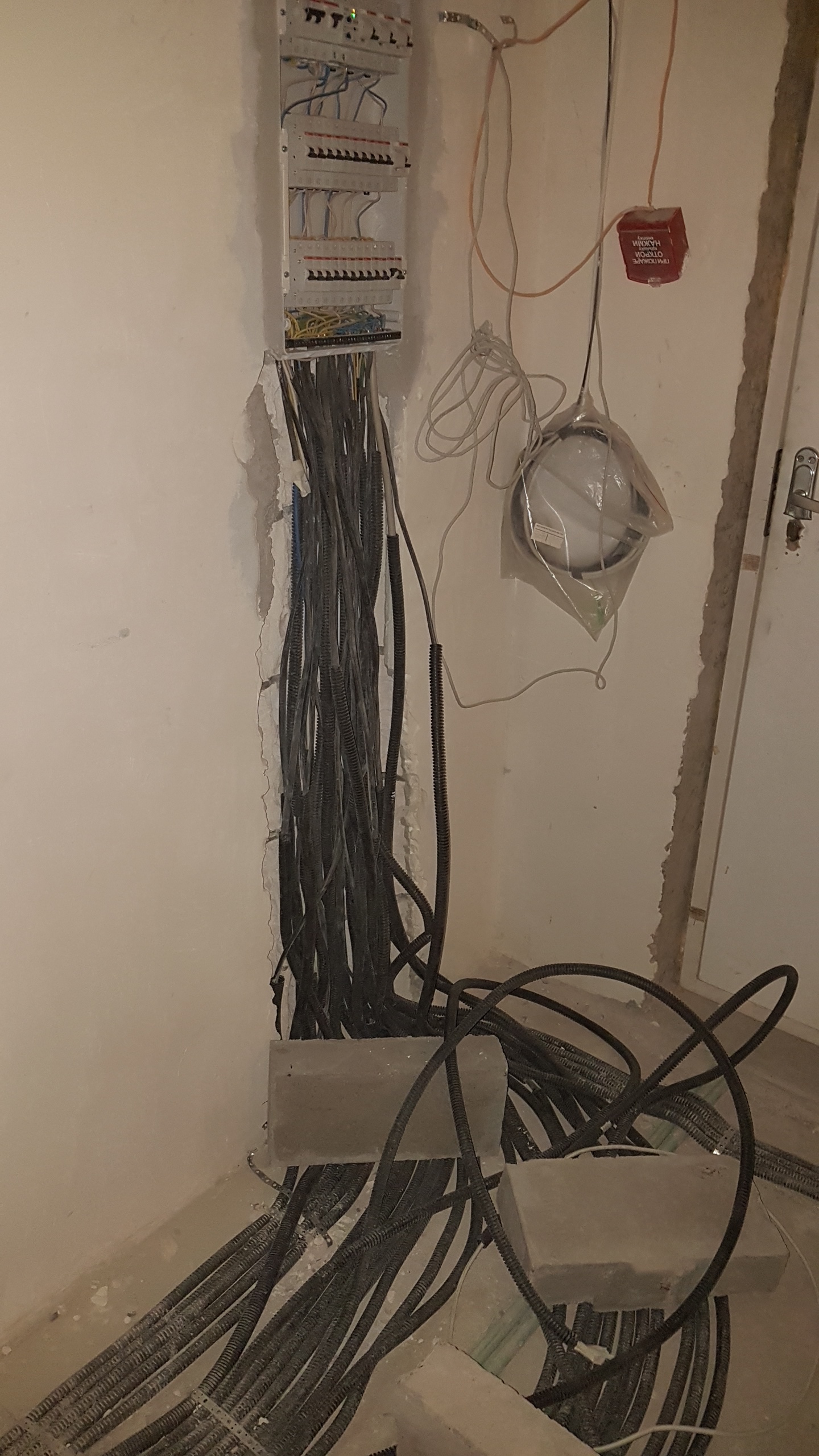 Люберцы. Октябрьский проспект д.1, 3 минуты от метро. Необходимо доделать электрику в двушке-новостройке под "ключ" На данный момент проложено 90% процентов кабелей, установлены подрозетники и собран щит. Количество точек около 75(выключатели, розетки, ТВ, Интернет) +5 люстр и 22 точечных светильников Не до конца проложен кабель по потолку для точечных светильников, сейчас есть только первая точка. Нет розеток и не сформированы кабеля в планируемых гипсокартонных стенах на балконах, порядка 15 точек, см. фото. Нет уверенности в правильности укладки кабелей для проходных выключателей(3 точки), возможно, потребуется что то дополнительно прокладывать. Общий свет выключается на входе в комнату, и с двух клавишных выключателей с каждой стороны кровати,вторая клавиша выключает бра со своей стороны кровати. Необходимо уложить кабеля возле щита для заливки пола, см. фото Нет розеток в ванной(3шт) и туалете(2шт) прокинут только кабель Установить сплиттер для ТВ возле щитка- провода подведены. Работы и оплату надо разделить на этапа: сейчас, и после чистовой отделки -для установки "арматуры". Перерыв где то месяц.