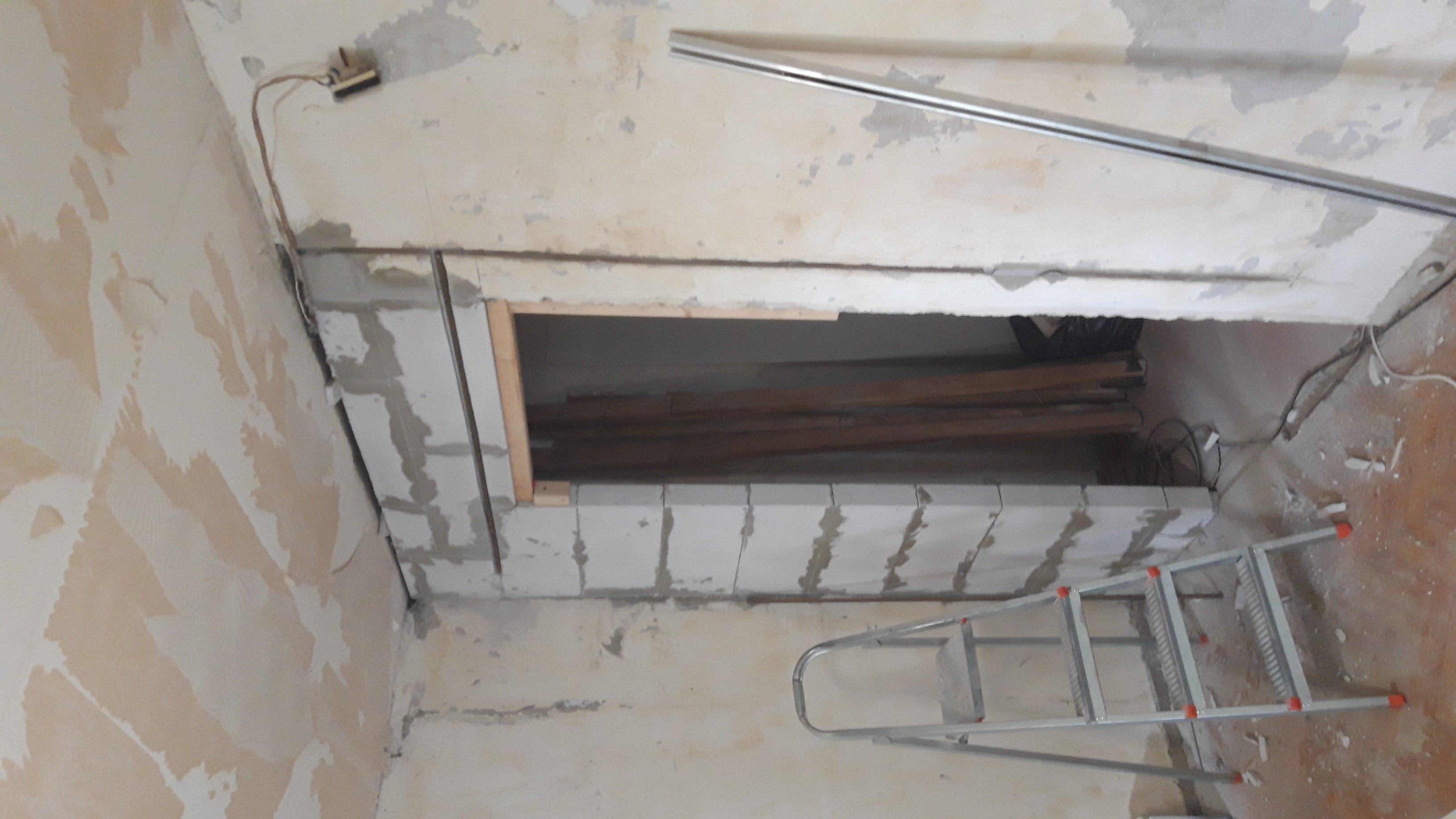Возведение стены из блоков толщиной 75 мм с армированием. Устройство дверного проёма. Установка арматуры над дверным проемом с двух сторон.