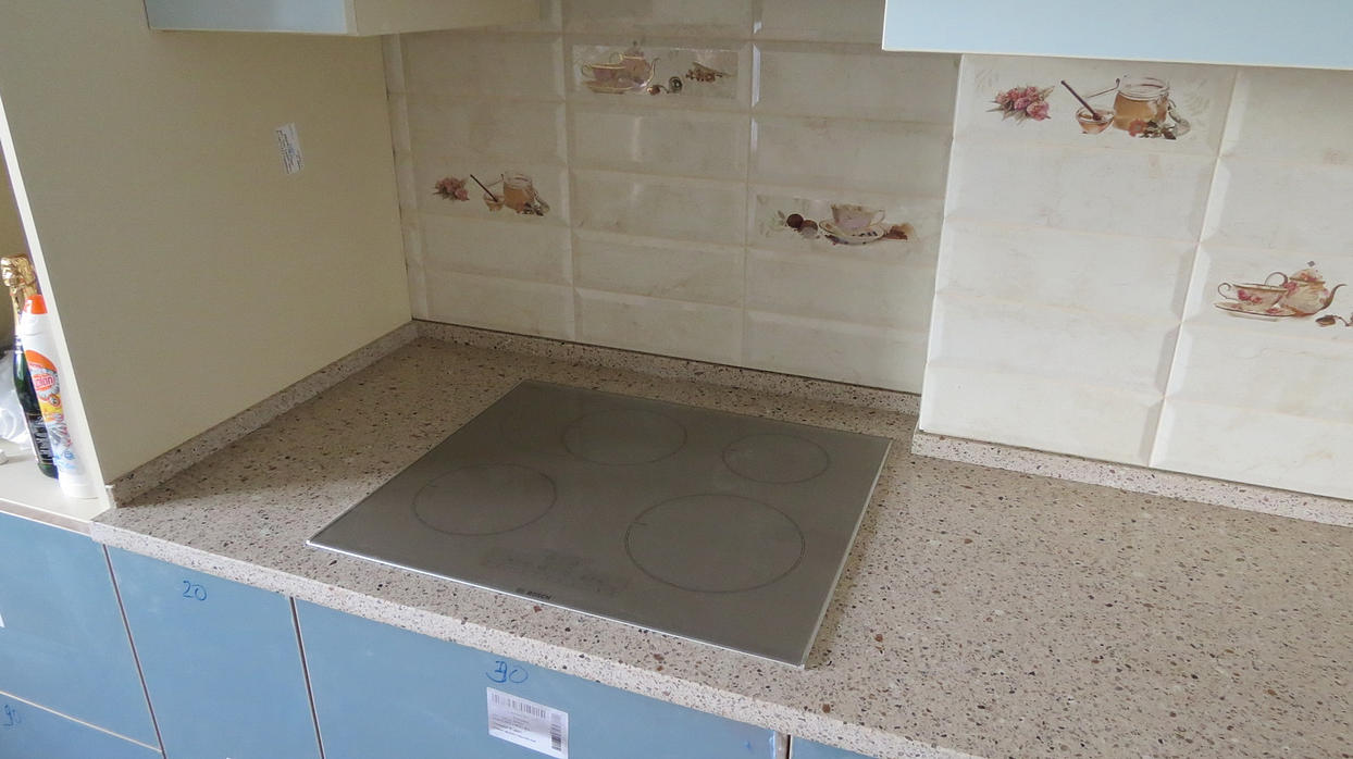 Столешница и плинтус из кварцевого агломерата Кристал Сахара от Техностоне. Несмотря на сложную конфигурацию, столешница поместилась в полосу размером 3м х 0.7м. Профиль С.
