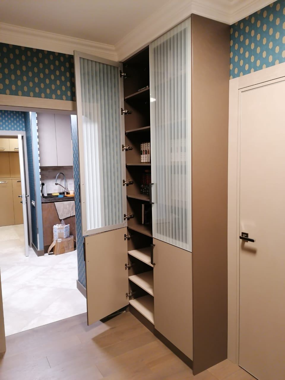 В данном случае двери комбинированные - панель Вудлайн кремовый и белое стекло. Наполнение размещено в алюминиевом профиле, покрытом эмалью белый глянец.