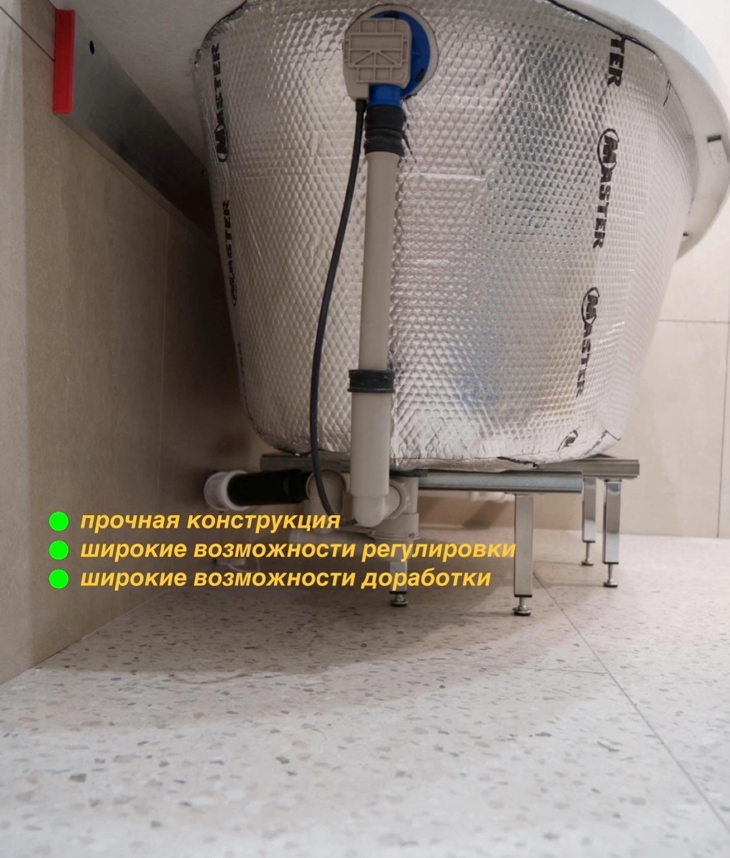 На данном этапе, ведя работы по монтажу и устройству ванны, я не решился использовать опору от производителя. Учитывая вес ванны наполненной водой+вес человека в ней+качество опрной конструкции, это была игра в рулетку: перевернется или не перевернется человек.