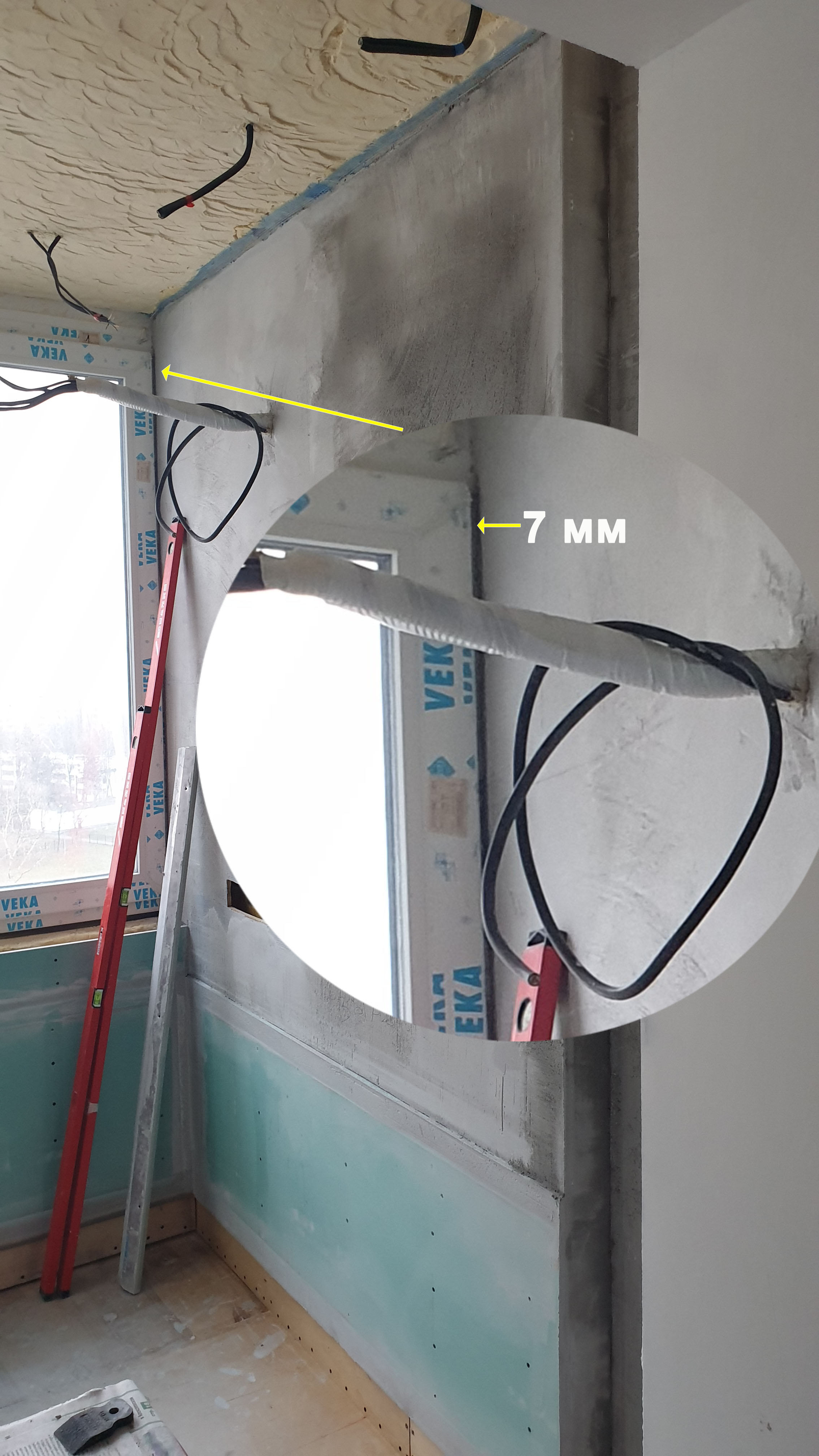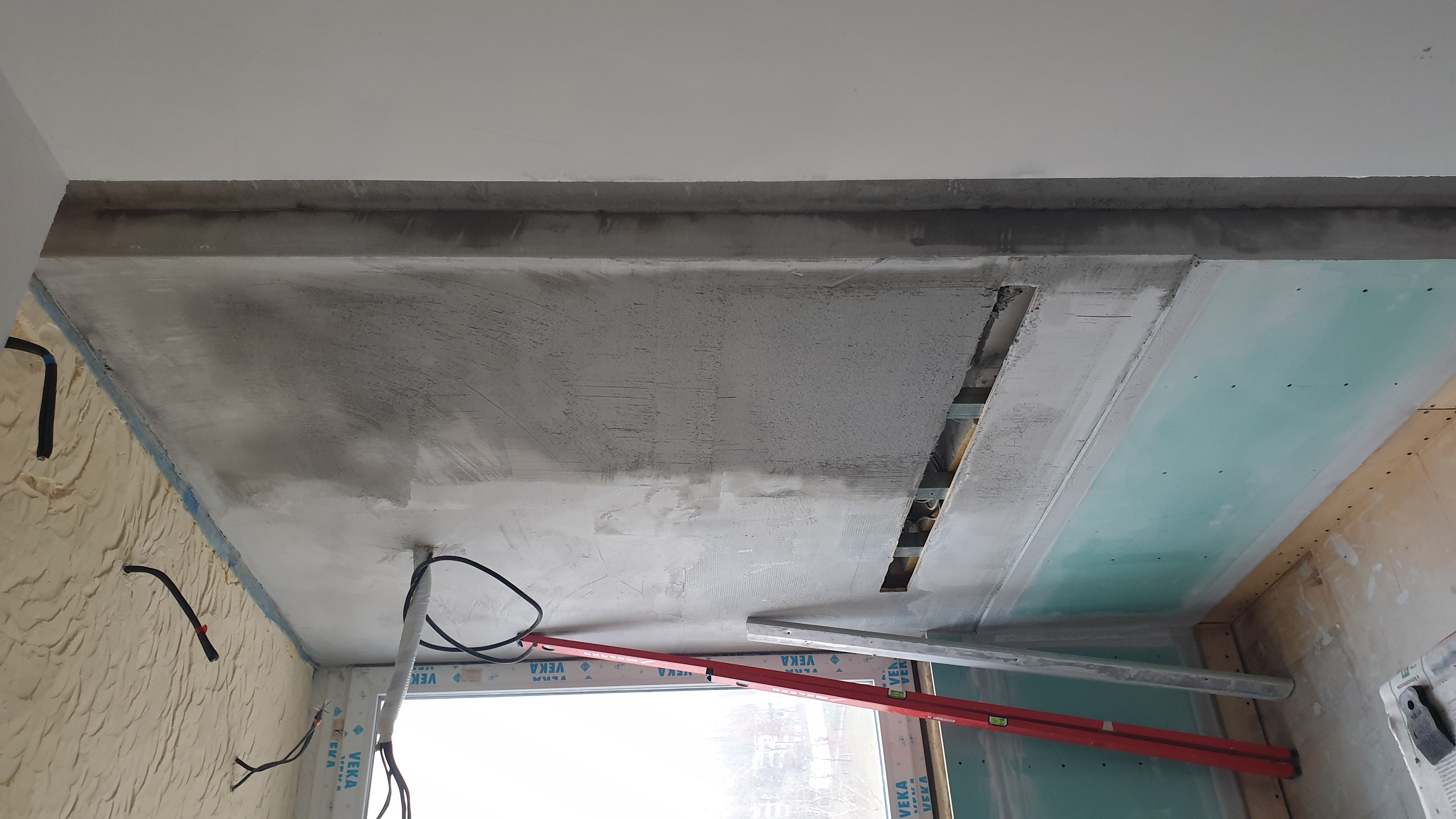 В данном случае - у окна, слой штукатурки не превысил 1,5 мм, на дальнем углу от окна( из за вздутия фанеры в 2-х местах ) слой дошел до 4 мм.