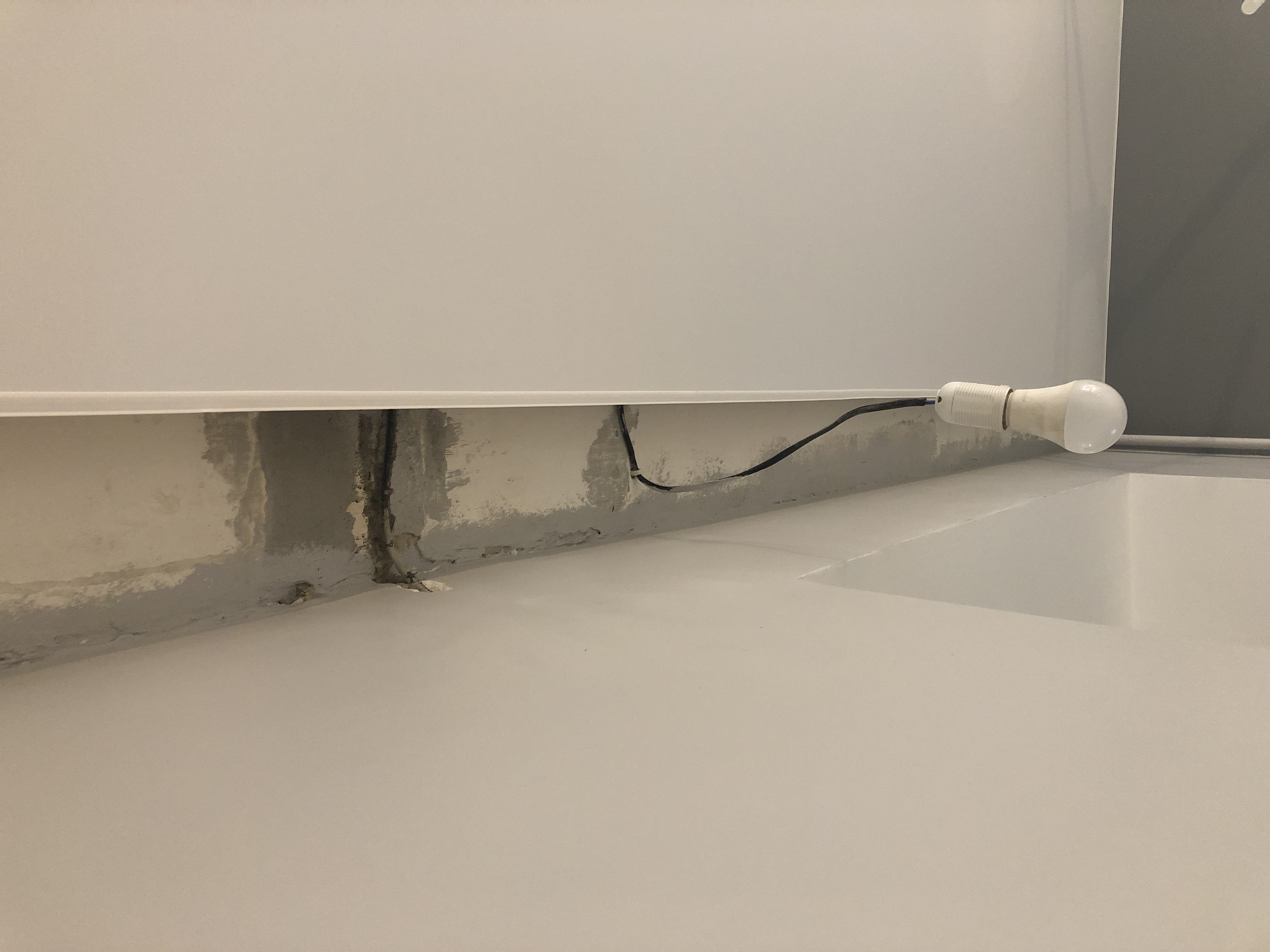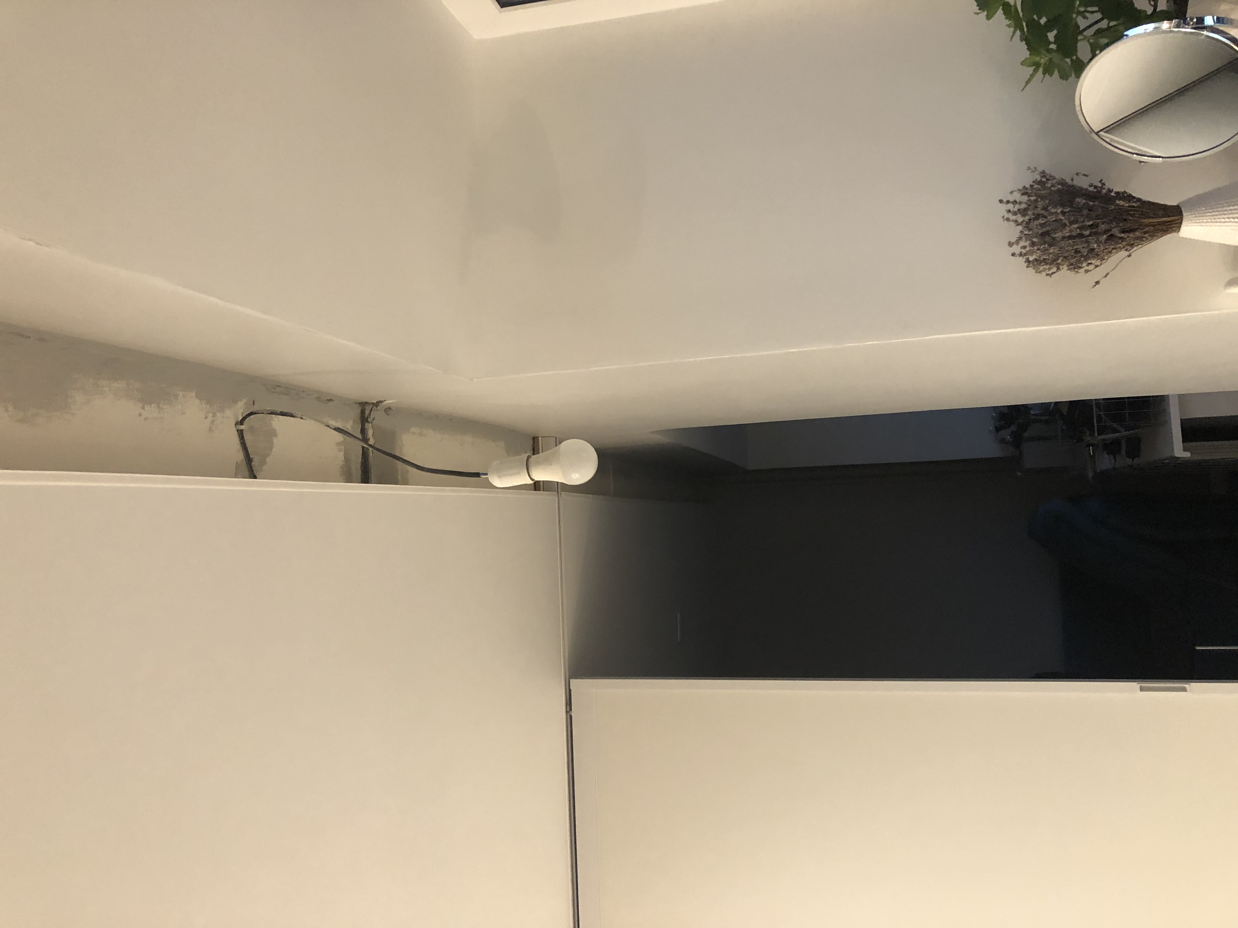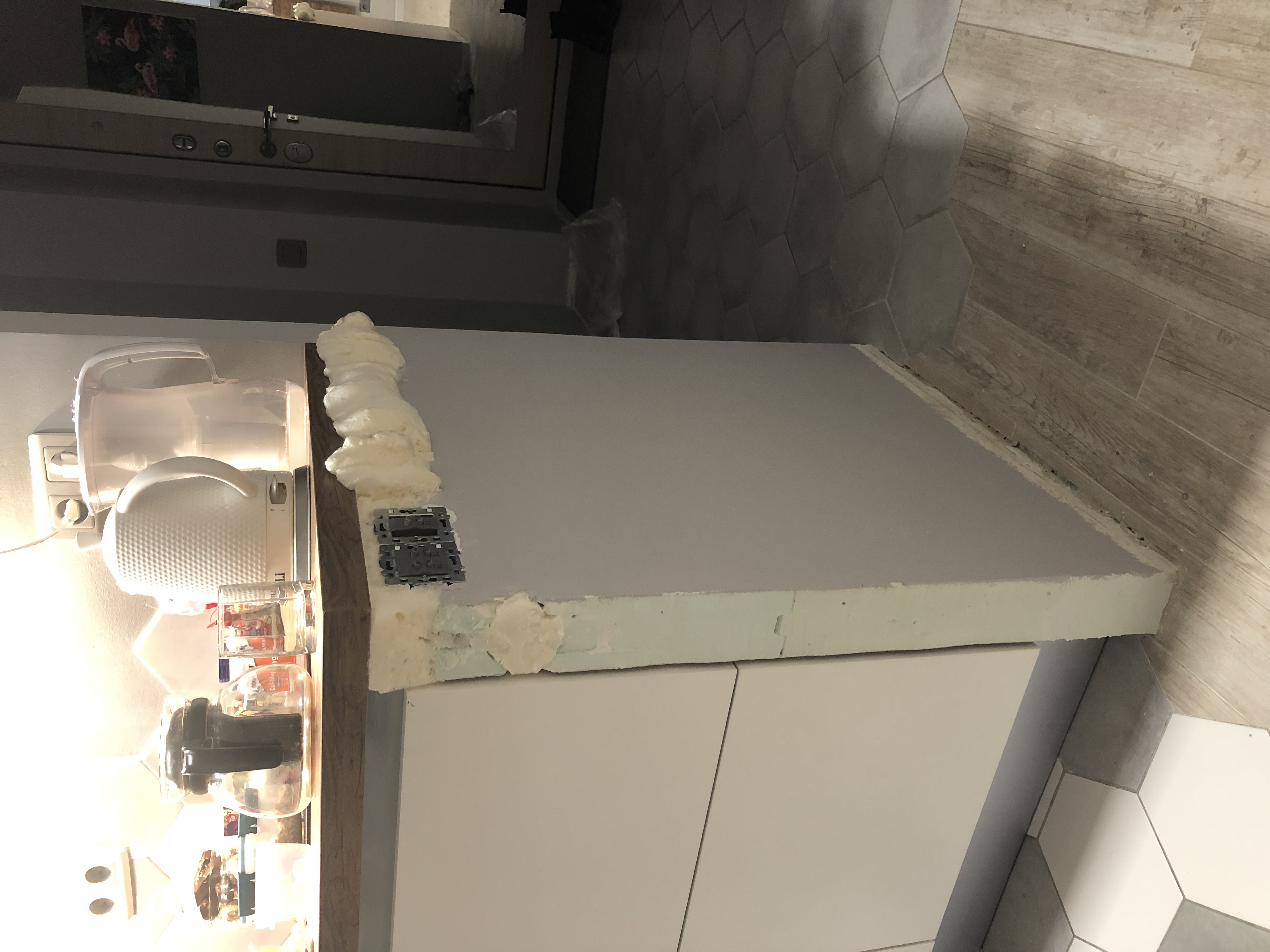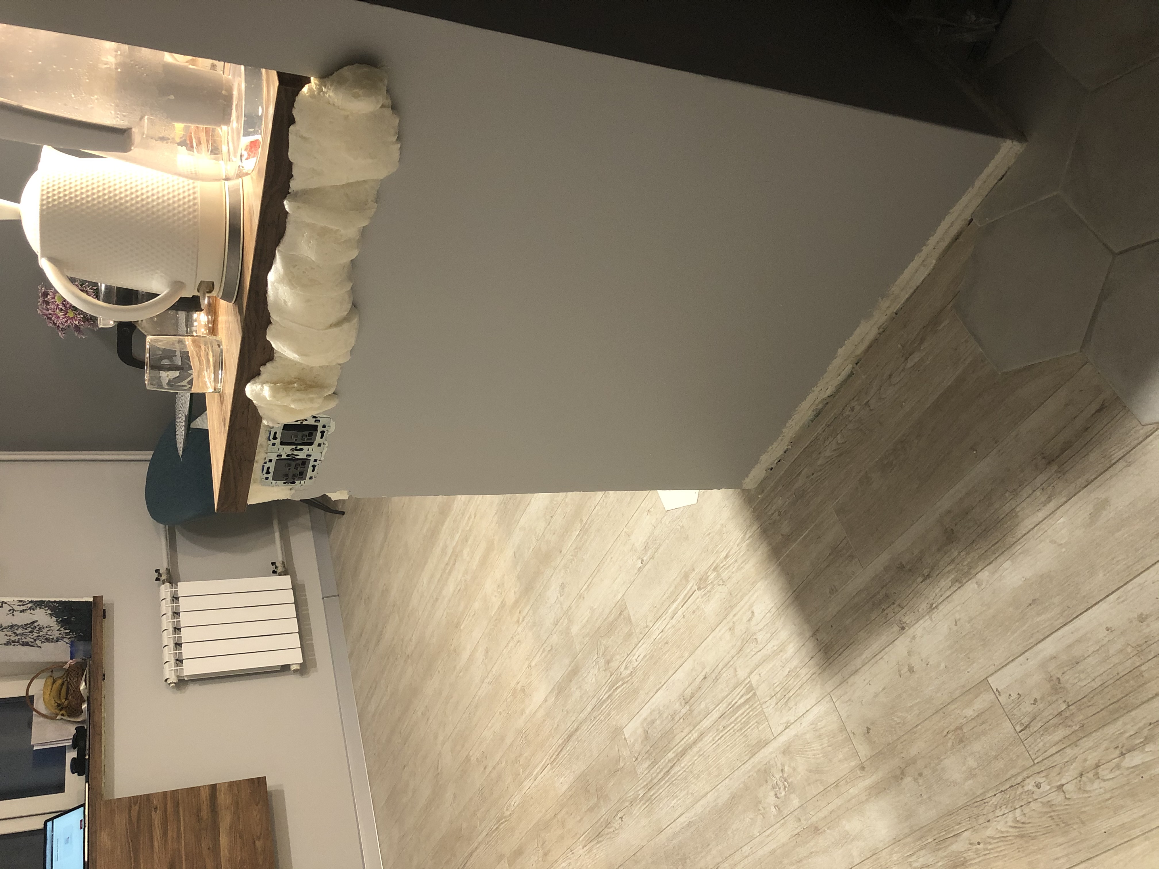 2.Небольшая стена в зоне кухни, срезать лишнюю монтажную пену в верхней части и выровнять, так же выровнять торец - срез пазогребневой плиты. Остальная часть стены уже покрашена.