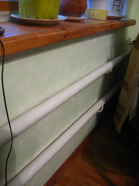 Вот сфотал, что мог. Остальное всё за мебелью. На первом фото котёл с, как я понимаю, обвязкой. На втором - труба слева идёт от котла на 2-й этаж, труба справа - обратка со второго этажа. На 3-м фото - вывод труб на 2-й этаж, по низу идёт обратка с 2-х комнат. На последнем - окончание одного контура в с.узле, там я думаю врезать ещё тёплый пол)...