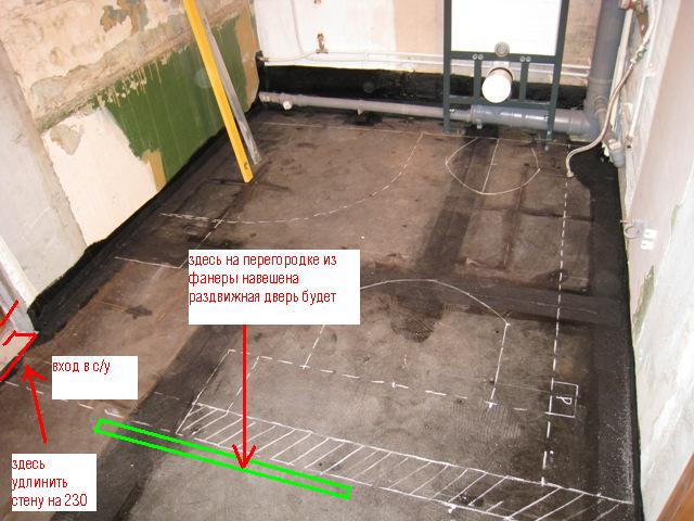 Здравствуйте, уважаемые специалисты. У меня вот такая проблема - нужно удлинить бетонную стену на 230мм и соорудить угол размером 450мм. Сначала про 230мм. Расширили санузел за счет коридора на немного. Стена между санузлом и комнатой бетонная 120мм толщиной. Её необходимо удлинить на 230 мм в сторону дверного проема. Дело в том, что как раз в эту достроенную часть будет упираться перегородка из фанеры между коридором и санузлом, со стороны достроенной части стены будет вход в санузел, поэтому перегородка упрется только верхней своей частью. Но дверь в санузел будет раздвижная с верхним подвесом и держаться будет на фанерной перегородке. Это довольно приличный вес и часто подвижный. Так вот засомневались - из чего можно сложить покрепче этой удлиняемый участок? Смущает именно размер - 230мм. Кирпич резать? Можно ( и надежно ли использовать) пазогребневые плиты? Оч хотелось бы плиты. Высота от плиты перекрытия до потолка 3000мм. Фотографии для большей ясности прилагаю.
