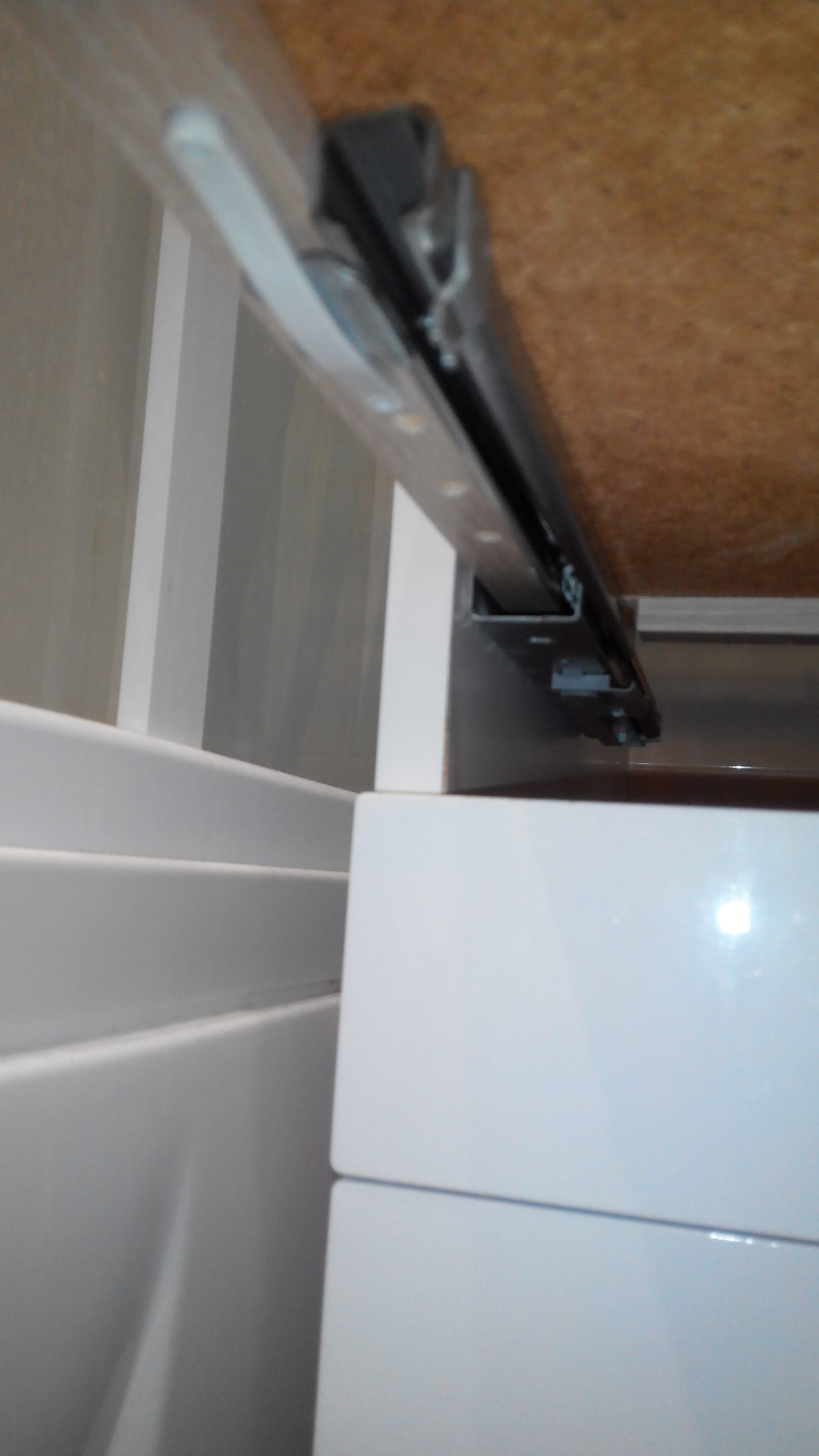 Вот фото частей конструкции: передняя (вид снизу) часть полозьев крепящаяся на ящике и задняя часть полозьев с доводчиком крепящаяся к стенкам тумбы. Может кто сталкивался с подобной конструкцией?