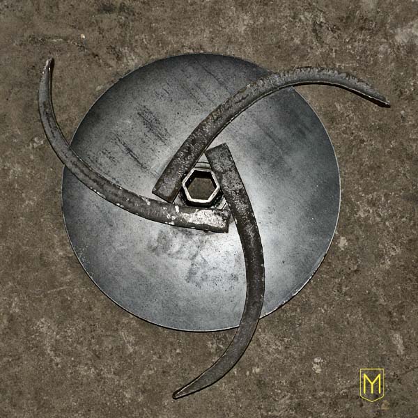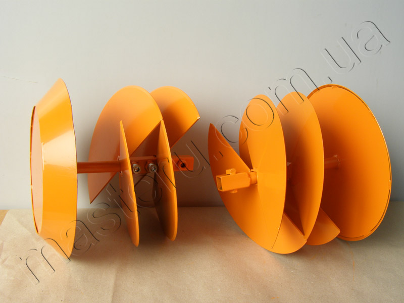 Хотел сделать фрезы типа "гусиные лапки" или "копьевидные" с плавным изменением угла изгиба стоек. При диаметре до 40см, мне не понравилось - малая рабочая часть стоек, "катушка" сильно большая.. См.фото. При диаметре до 50см - уже смотрятся. (Диаметр диска для сравнения равен 35см). Возможно, проще делать культиватор с набором стрельчатых и долотообразных лап.