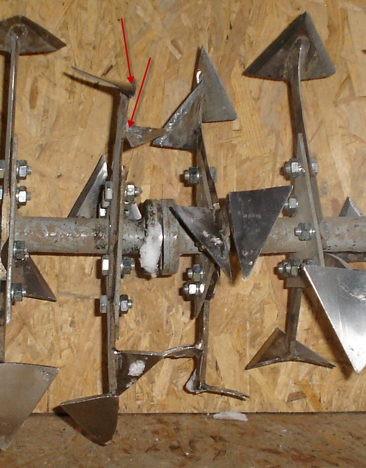 крутящий момент на валу нужен меньший и тяга меньше завит от состояния грунта - это плюсы. Но, копьевидность имеет один недостаток - фреза боится корней деревьев, твёрдых предметов и т.п. под землёй. Тут стойки должны быть прочные - вот это условие меня больше всего и сдерживает.