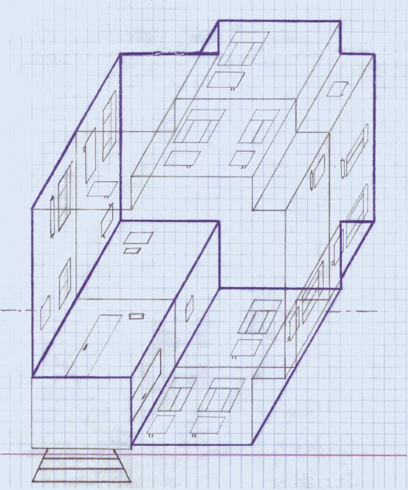 - Чертеж дома в изометрии с обозначенными местами установки радиаторов отопления