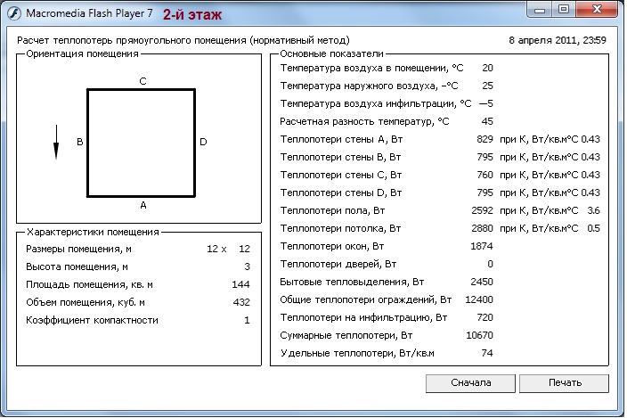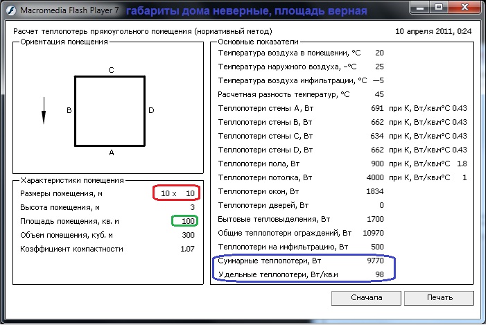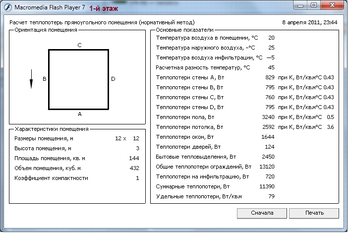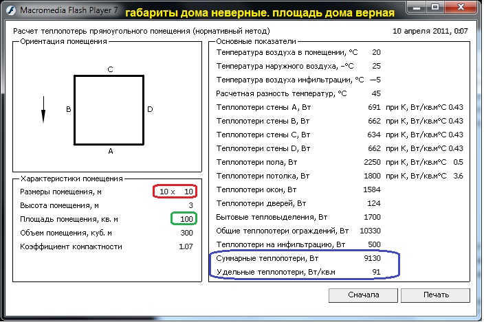 - Расчет теплопотерь по первому этажу. Расчет произведен при помощи программы с сайта vladirom.narod.ru При этом в качестве размеров я заколотит габариты дома. В результате у меня получилась площадь почти в 1.5 раза больше, чем реальная. Это связано с тем, что дом имеет изломанные стены. При повторном расчете теплопотерь я указал неверные размеры дома, но зато получил "мою" площадь. При этом общие теплопотери снизились, а теплопотери на кв.м. увеличились. Оба варианта расчета я прикрепил