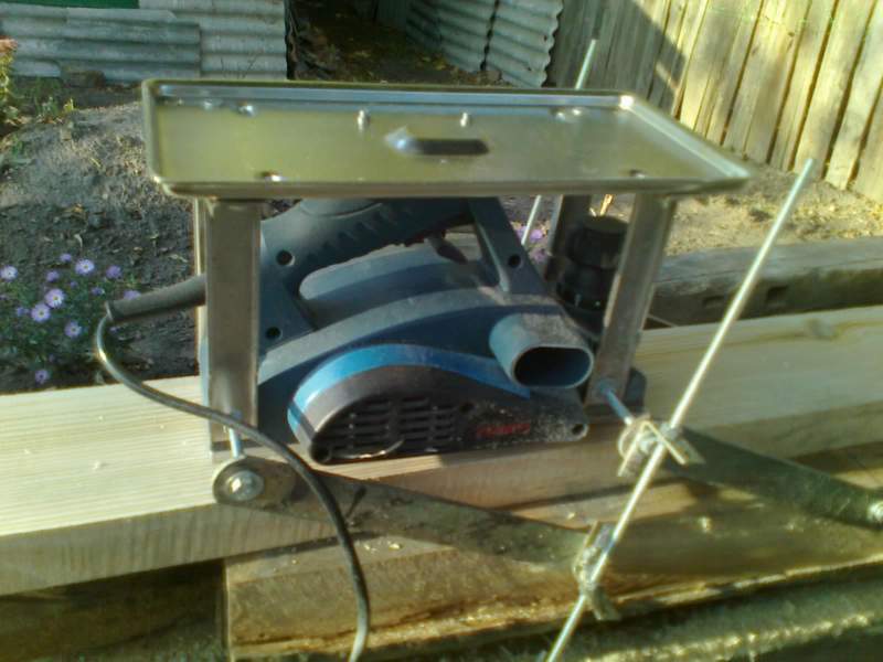 Дмитрий, увидел Вашу приспособу, понравилась. В точности повторить не могу, нет такой направляющей, да и у меня не стояло задачи обрабатывать заготовки большой длинны, у меня до 2 метров. Еще здесь же на форуме видел заводскую приспособу от Боша, но она строго по ширине рубанка. У меня же рубанок Темп с ножами 82мм, а заготовки - доска 40х120. Опыта работы с электрорубанком немного, боюсь ровно не выстругаю. Вот и придумал/соорудил на скорую руку свою приспособу: