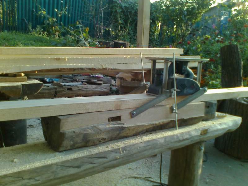 Как видите, у рубанка своя штатная подставка, отверстия для ее крепления я и использовал. Вместо штатных винтов взял болты М6х70, отрезал из полосы 4 ноги, пакетом просверлил на концах их отверстия диаметром 6мм. Подставку оставил, так как на ней есть приспособа для фиксированного включения рубанка. Для основы приспособы взял брус с разобранного сруба, выровнял плоскости, как смог, обпилил боковины до ширины ног. Далее разметил отверстия для крепления ног, они должны точно соответствовать отверстиям в корпусе рубанка, иначе не будет паралельности подошвы рубанка и верхней плоскости основы. Верхние части ног шарнирно зафиксированы на болтах и подтянуты гайками, нижние прикручены шурупами (Д6) к основанию. Шпильками с гайками выставляется высота подошвы рубанка над основанием. Максимальная высота - около 150 мм. Конструкция примитивная, и с виду хлипковата, но показала себя в работе отлично. По крайней мере с задачей справилась :)