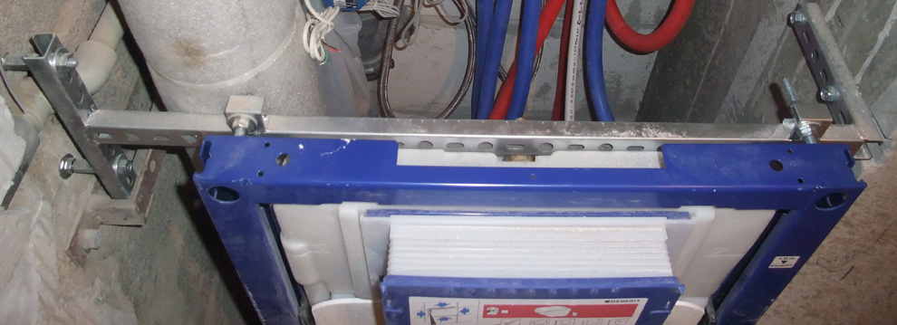Инсталляция зашивается двумя слоями ГВЛВ 12.5 мм, листы прикручиваются к самой раме инсталляции саморезами по металлу. Это важный момент,т.к. ГВЛВ участвует в прочности и жесткости всей конструкции в целом. На ГВЛВ (желательно на эластичный плиточный клей) кладется плитка. Суммарная толщина стенки перед рамой составляет 35-40 мм
