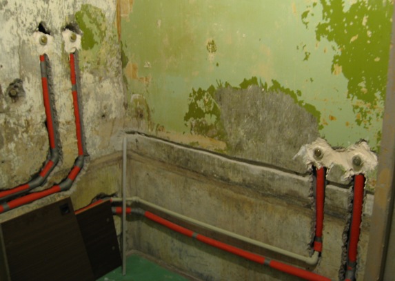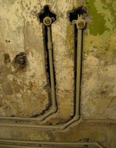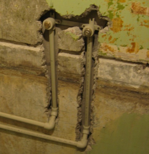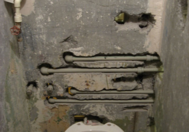 Там на фото 1. – водорозетки в ванной. Те водорозетки, что слева и выше от пола, наверняка похожи на ваш случай. За этими водорозетками находится пустота, там вентиляционный стояк. На самом деле за всей левой стеной находятся четыре вентиляционных шахты. Потому штробы для труб в некоторых местах сквозные, т.е. доходят до пустоты этих шахт.