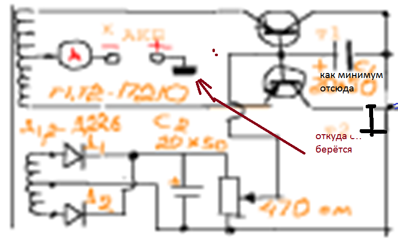 эта схема нерабочая. + берётся с массы или корпусса только где на схеме второй вывод или масса из вакуума рождается какая связь с трансом и вообще с схемой.цепь протекания тока через батарею куда замыкается , плюс то где на схеме?