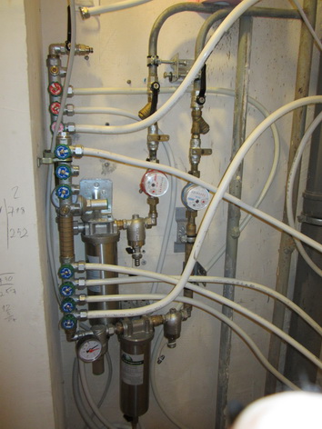 Да, обратные клапаны в накидных гайках счетчиков?-удаляйте однозначно. Проверьте грязевики. Зря подключили IBOX к отводу коллектора,-дополнительное падение давления, хотя и не такое критичное при таком расходе лейки. Установите манометры в фильтры, вы же даже не знаете, какое в стояках давление, может редуктор и на 3.5-4 бара можно выставить...