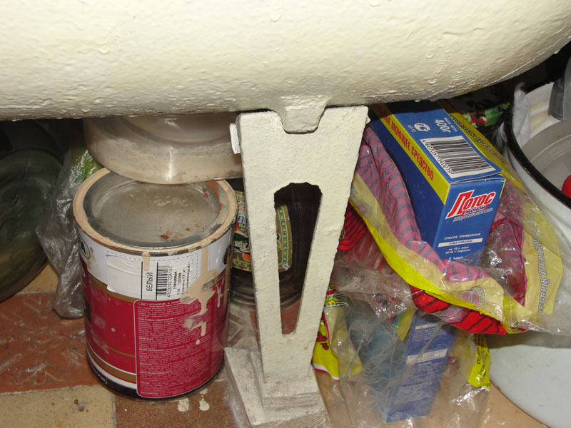 Здесь ножки упираются в деревянные бруски.У ванной есть выемки, которые как бы зацепляют ножки. Теперь я сфоткал поближе как ножки соединены с ванной