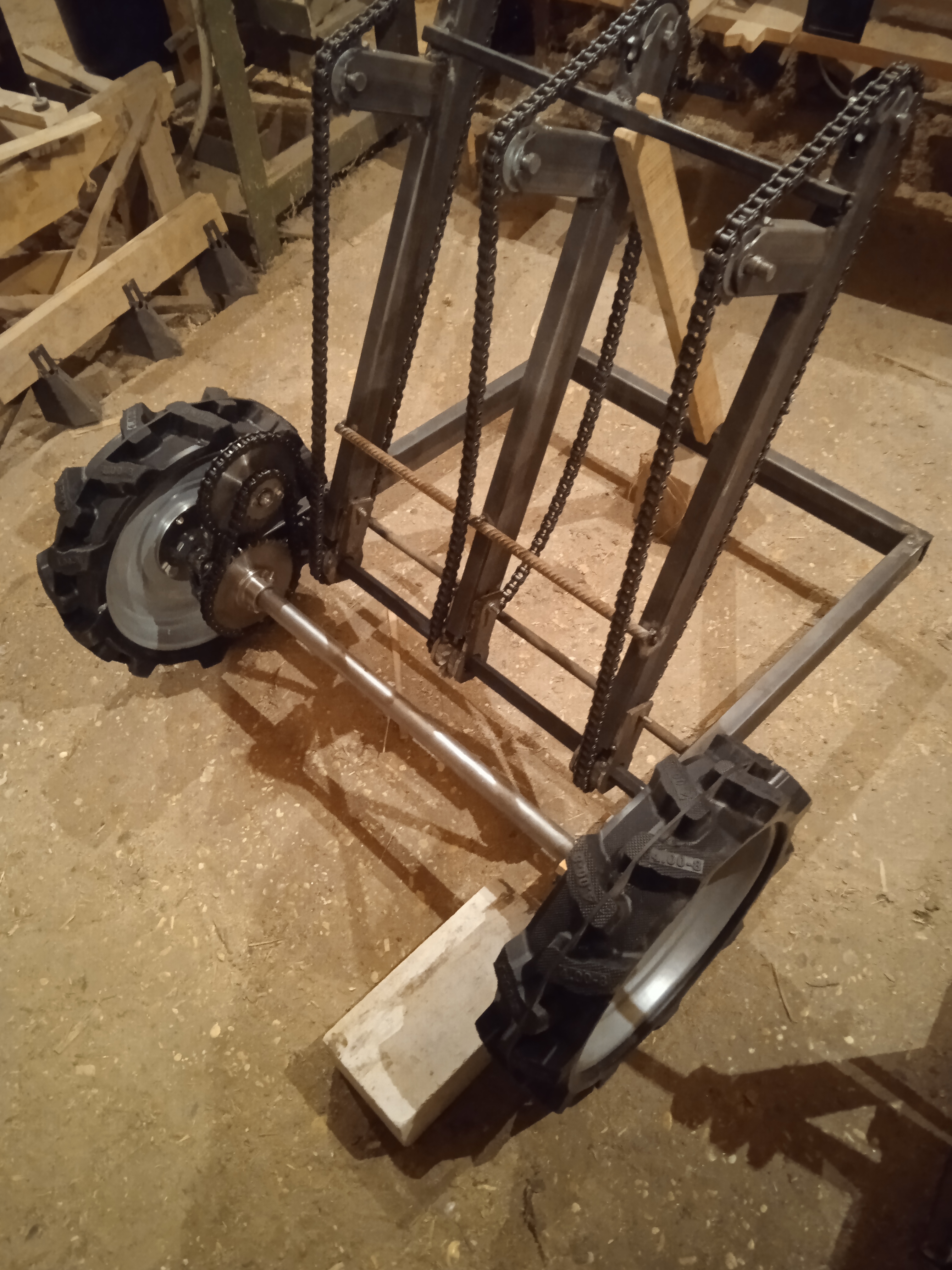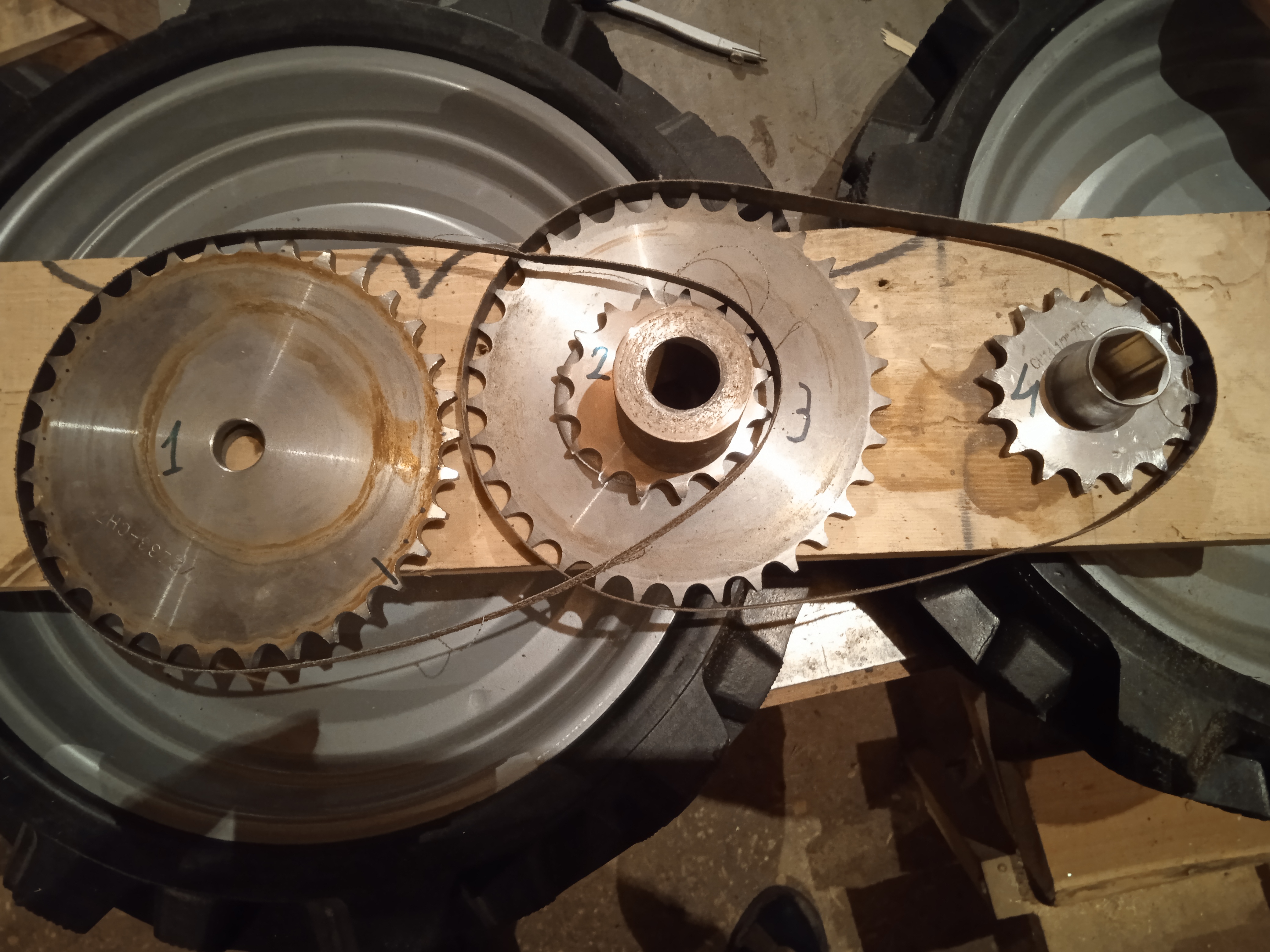 Считаем - 75мм х 12 ложек = 900 мм (длина окружности полного оборота). 900/ 3,14 = 287 диаметр звездочки. Проверяем - 400 (диаметр колеса) / 104 (шаг посадки) х 75 (шаг ложек) = 288 мм (диаметр звездочки).