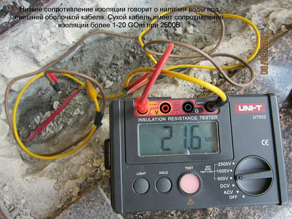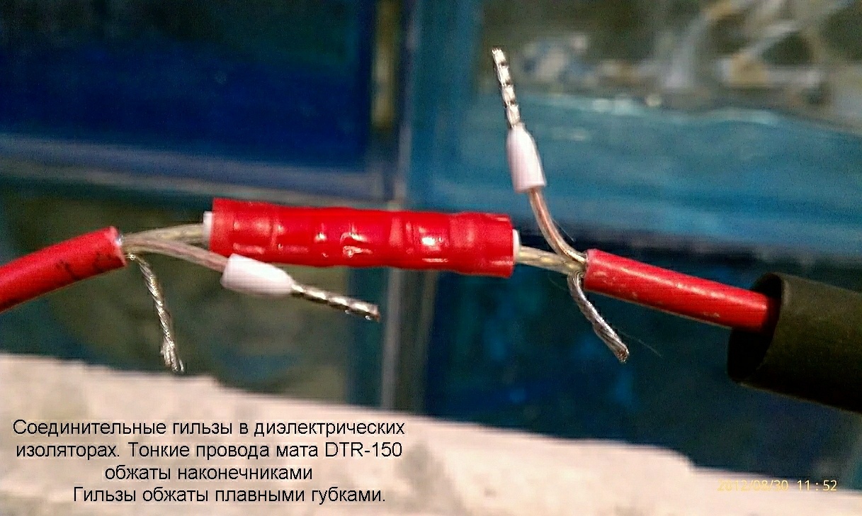 Если посмотрите на дату фотографий, то это с вчерашнего ремонта муфты мата. Проблема типична для маленьких длин кабелей, где нагревательная жила очень тонкая, как волос. Обычную гильзу с силовым и нагревательным проводом опрессовывает автомат на производстве. Недожим или пережим вгильзе и контакт нагревательного провода пропадает или же термическое хождение оболочки кабеля при нагреве-остывании и его самовыдергивание. В моей муфте увеличивается площадь и длина контакта провода, потому что он сложен в наконечнике, а потом зажимается в гильзе плавно, не продавливая Т образно, как автомат на производстве. Гильзы ВМ в диэлектрическом изоляторе и я не переживаю, что будет пробой между ними или экрана на нагревательную жилу. В заводских муфтах обычные гильзы, сверху термоусадка, которая может размягчиться при нагреве внешней и больше вероятность повреждения из-за её прокалывания. Чтобы нормально натянуть первую клеевую термоусадку используется 12мм, вторая 16мм. Термоусадки среднестенные, усаживаются хорошо на любой диаметр кабеля или мата, с визуальным контролем качества и выделяемого клея по бокам. Все муфты могут спокойно работать, находясь полностью в воде, но всегда нужно стараться, особенно при монтаже системы снеготаяния, укладывать их в сухом месте, надежнее будет. По поводу сопротивления изоляции нагревательного кабеля, для меня это основной фактор при диагностике системы. И эти данные отличаются от обычной электропроводки, немного разные происходящие процессы. Так сопротивление в несколько десятков мегаомм- это ничто, кабель поврежден или затек водой. Пока нагревательная жила цела и будет держать автоматика, будет работать до последнего, но как правило не долго. Сухой, нормальный кабель имеет не менее 1GOm между нагревательной жилой и экраном. На 5+ это более 20GOm, будет работать более 50 лет. Все эти заключения и выводы не найдете ни в одной таблице или описаниях, это складывалось после многолетних наблюдений и практики при ремонтах нагревательных систем, может кому-то пригодится.