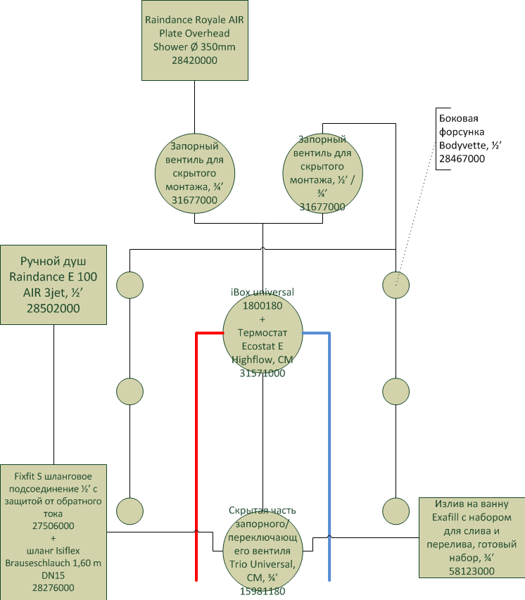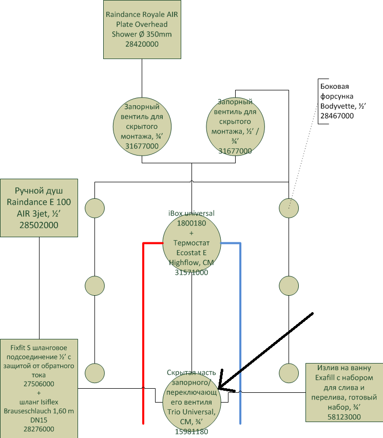 Возможно, нижний вентиль 31677000 не нужен: для излива на ванну и ручной душ достаточно переключателя Trio-Stop. Будет не так громоздко, и проще управлять. Останется 4 скрытых элемента: 2 вентиля 3/4" сверху (верхний душ, форсунки), под ними - термостат HighFlow в i-Box, а снизу - только переключатель Trio/Stop (излив на ванну-ручной душ-стоп). Ручной душ я всегда включаю на максиму; у него всяко небольшой расход. Вод излив на ванну - дело вкуса: Trio|stop не порегулируешь. Кстати, есть дизайнерские решения, где для 4 потребителей тупо ставят 4 вентиля: красиво и всё понятно.