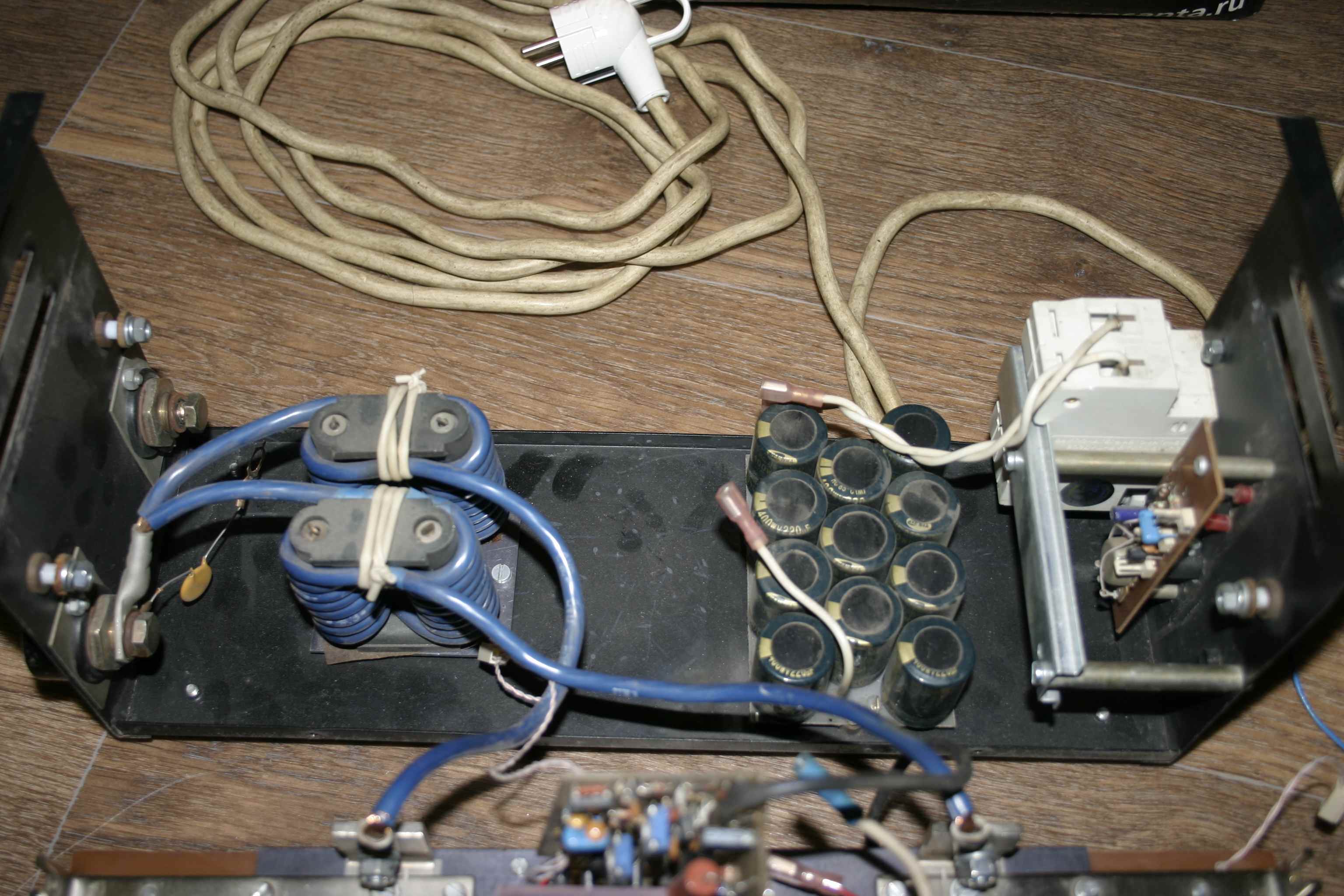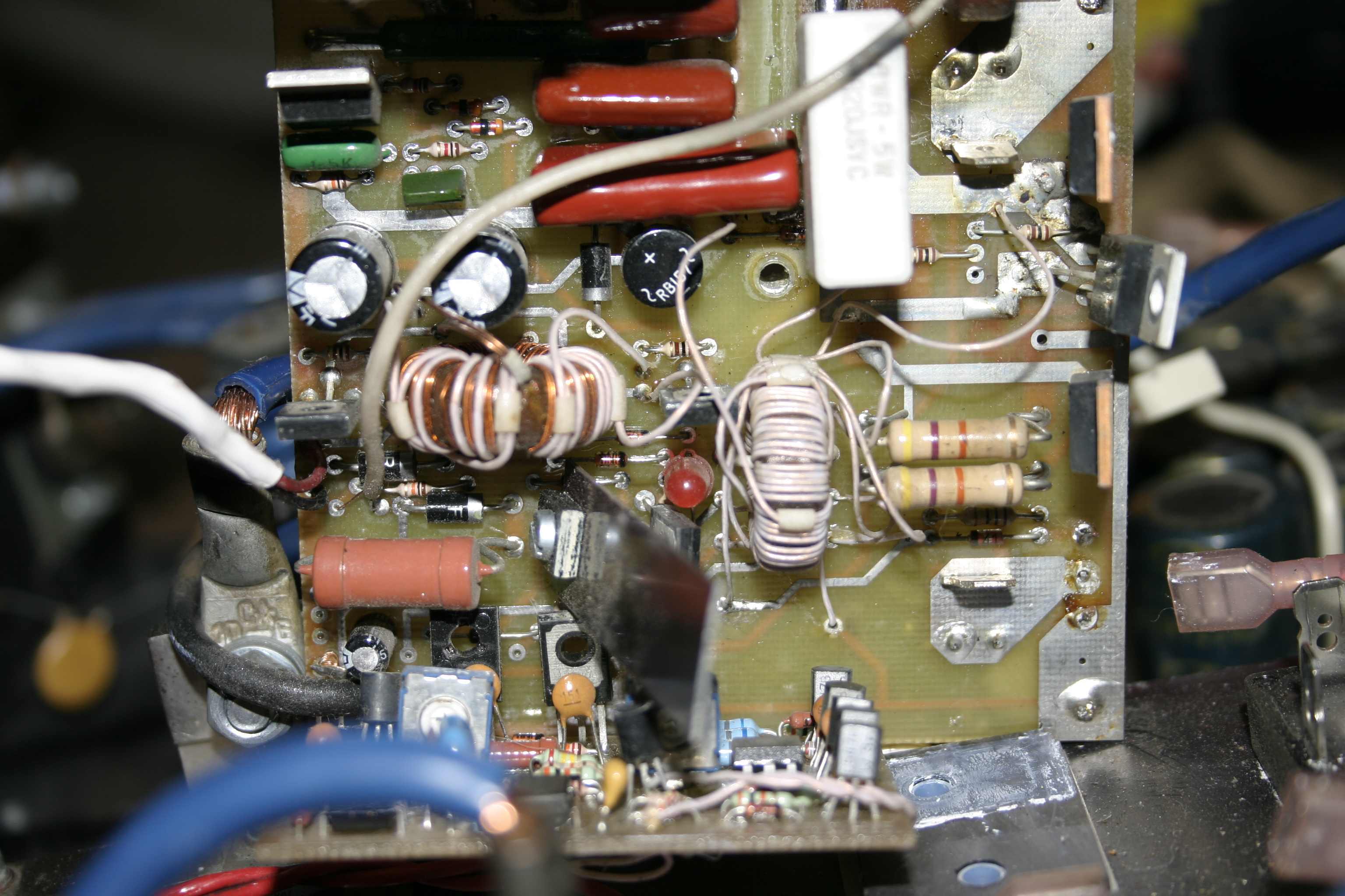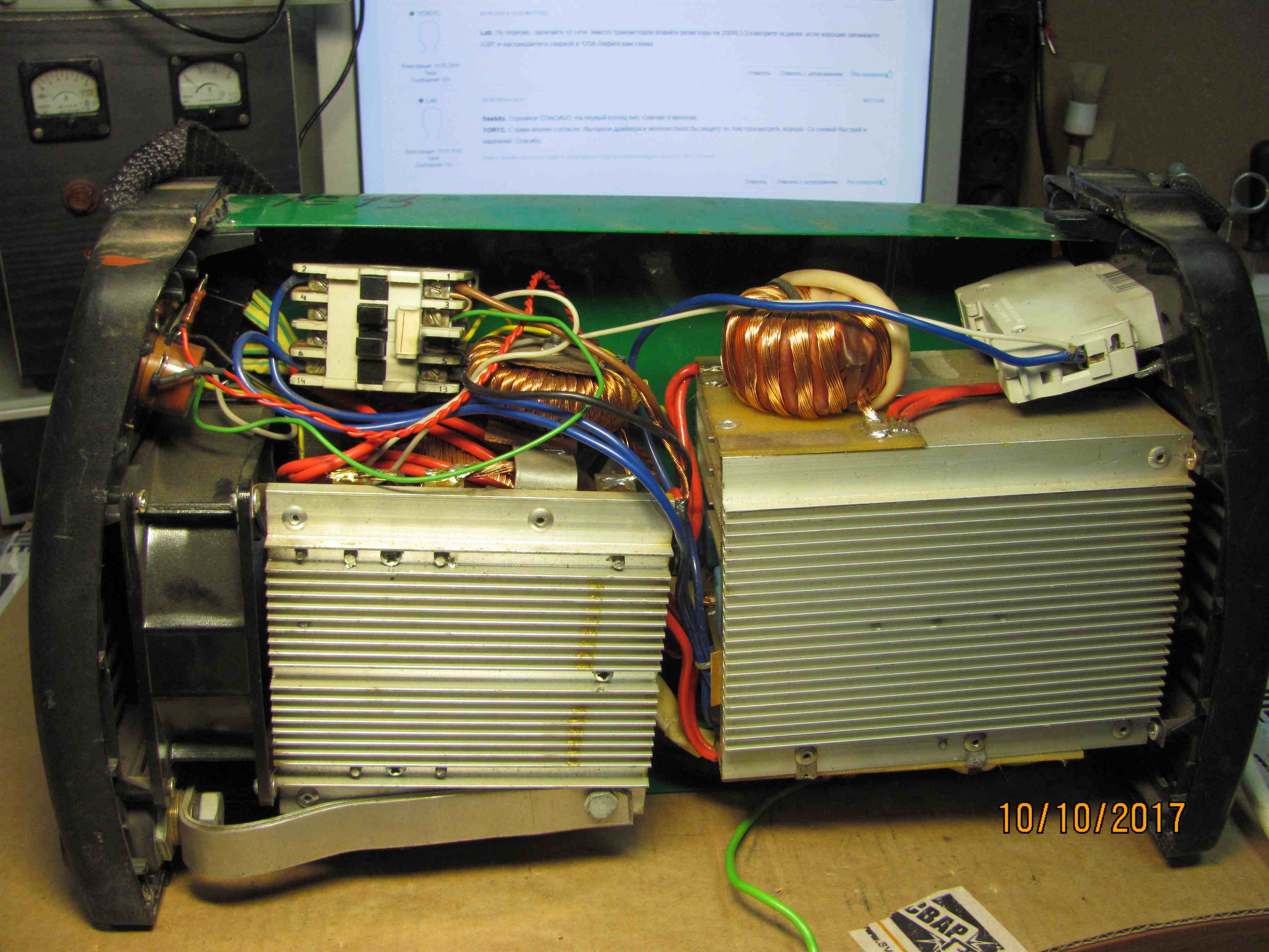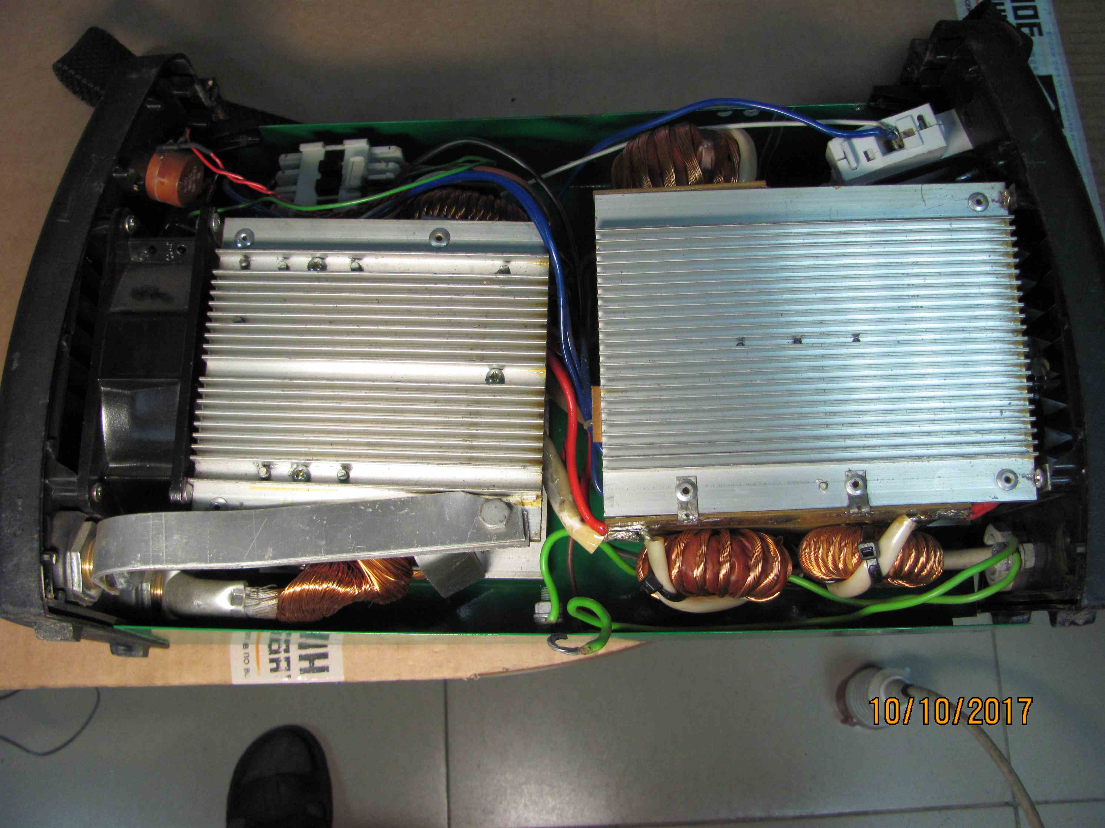 Принесли вот такое гаражное творение. Совершенно не ремонтопригодный аппарат. Всё косое\кривое, всё на заклёпках, к платам с силой не подлезть. Снимаешь боковые кожуха - радиаторы разваливаются пополам, болтаясь на проводах. Слева вверху магнитный пускатель прикручен на один болт, и телепаясь туда-сюда коротнул своей перемычкой на трансформатор, в котором от этого прогорела дыра. Изоляция жёлтого провода расплавилась, лёжа на этом трансформаторе, и прикипела к обмотке.... Короче жесть! :killyourselfbywall: От ремонта отказался.