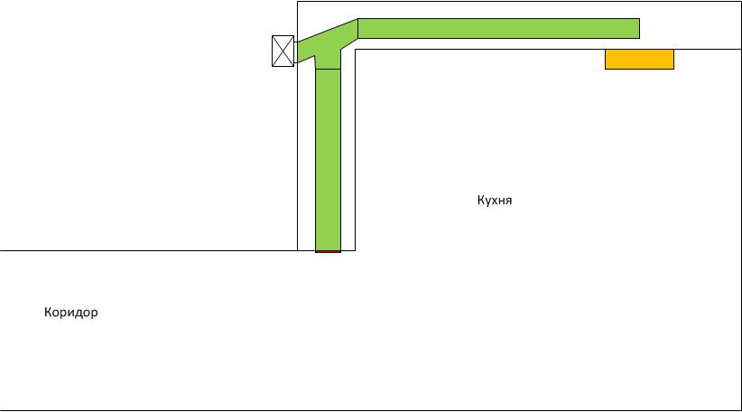 собственно что есть и что хочу: есть вент.отверстие на кухне. хочу сделать короб из ГКЛ над кух.гарнитуром и хочу в этом коробе проложить гофрой (помечена зеленым) два вент канала: 1) до вытяжки (желтый прямоугольник); 2)до вент отверстия на ГКЛ-коробе (красная полоска ближе к коридору). Сделать так захотел, потому что не хочется что бы вытяжка закрывала всю вентиляцию на кухне. Вопрос: 1)какие ошибки или возможные проблемы в таком решении; 2)есть ли смысл шумоизолировать гофру? например какой нибудь минватой или чем-то таким. Или что использовать для этой цели?
