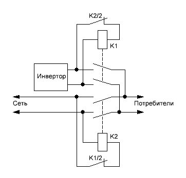 macsafe написал : Что есть взаимоблокировка? Мне контактор нужен только для переключения сеть-инвертор при пропадании входа. Реле времени тут второстепенно. Если бы вы набросали свою мысль, был бы благодарен. Просто 2 контактора - 2 катушки. И тут возможны варианты с их залипанием, как мне кажется. А когда катушка одна - тут все однозначно