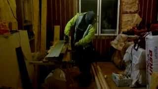 Звуковик, сцуко, свой плеер с наушниками возле камеры подвесил. Я его тоже вздрючу, как появится! :) По сценарию там слов не много- заказчица на заднем плане в окне маячит, доска с брусом склеены в 9-тисантиметровую нагрузку, глоток пива перед заездом (камера не ухватила этот сокраментальный сюжет), пилка длинная Бош Спидвуд, искры и немного матюков незлобивым тихим словом...