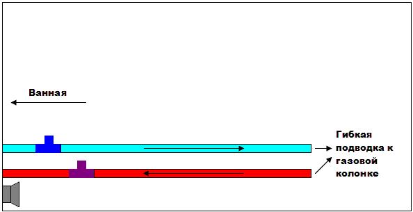 На картинке условно размечено как идут трубы на кухне. Синяя - хол.вода, красная - гор. вода, серая - канализация... Все чугунное. На трубах темным цветом выделены тройники. Канализация на кухне заканчивается. Вопросы:
