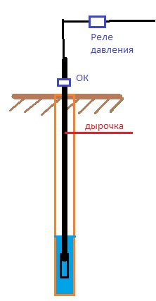 Вроде должно работать - но смущает только отверстие в трубе в скважине.... Будет ли через него вытекать вода из двух метров трубы: от отверстия до ОК? Если вода будет вытекать - то при каждом включении насоса, у меня будет в трубе бежать 2 метра воздуха а только потом вода... - вот этого мне не хотелось бы...