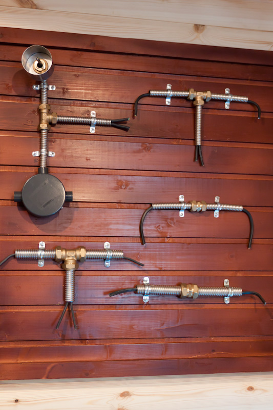 я розетки снизу заводить в бревно буду, а свет по дверным коробкам. ретро-провод это дело тонкое : если делать "по простому" то получится советская дача. а чтобы смотрелась круто, надо интерьер делать высокого уровня ....
