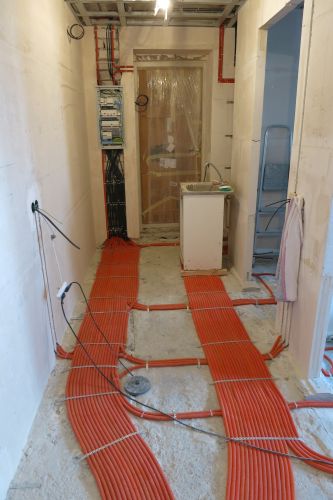 Трубу подогрева стоит заливать за один замес. Получится более толстая и прочная плита, которой, один хрен, придётся расширяться синхронно, даже если трубы были бы уложены позже, поверх первой стяжки. При укладки трубы в стяжке нужно следить за её горизонтальностью. И эта горизонтальность не должна быть нарушена ногами тех, кто будет стяжку заливать. Мне приходилось делать подобную конструкцию, только было это 10 лет назад и не называлось Пластбау. Была задача сделать тонкую, легкую и жесткую стяжку в деревянном доме. Потому на фанерное основание были уложены островки из пенополистирола 60х60 см и высотой 6 см. В промежутках между островками (ок. 12 см) была уложена арматура 12мм, которая позже была приподнята на 1 см за счёт подвязывания к сетке 50х50, что была уложена поверх островков. Поверх сетки была уложена труба, накрытая вторым слоем сетки. В промежутках между трубами до второй сетки набросали остатки арматуры. Высота стяжки составила 4 см. Можно было весь ЭППУ заменить на дерево, но ЭППУ уже был в наличии. По электрике Вам нужно понимать, что провода протекающим током нагреваются. Тепло этого нагрева нужно отводить. Кабель, уложенный в штукатурку, находится в условиях небольшого теплового сопротивления в сторону окружающей среды. Для этих условий залегания установлены табличные допустимые токи для кабелей. Для кабеля. залегающего в теплоизоляторе, эти значения уже будут завышены за счёт большего теплового сопротивления. Потому нужно завышать сечение кабеля или не укладывать кабель в пенопласт. Та же проблема случается при прохождении кабеля через области, подогретые трубами отопления, горячей воды или другими кабелями.