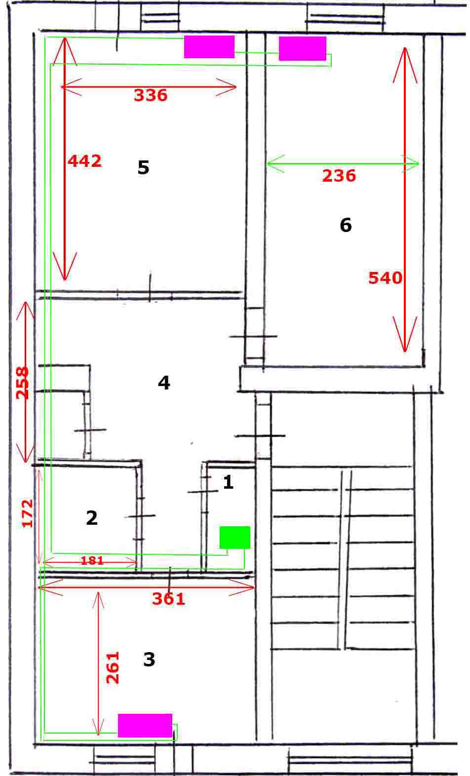 Помогите пожалуйста с выбором котла и схемой монтажа автономного отопления. Решили заделать автономку в квартире. Квартира двухкомнатная. Централизованного отопления считай что нет (радиаторы еле еле теплые). На схеме цифрами обозначены следующие объекты: 1-туалет; 2-ванна; 3-кухня; 4-коридор; 5-зал; 6-спальня. Красными цифрами обозначены габариты площадей. Планирую приобретать электрический (газовый отпадает по закону) котел для обогрева трех радиаторов. Сам котел на схеме обозначен зеленым прямоугольником. Радиаторы-прямоугольники с сиреневой заливкой в кол-ве трех штук. Котел планирую монтировать в туалете, затем через ванную контур идет к радиатору на кухне, после через ту же ванную и коридор в зал и спальню (на схеме трубы обозначены зеленым). И возвращается обратным ходом в туалет. Примерная длина всей системы 50 м, отапливаемая площадь около 40 м2. Котел только однофазный. Есть ли что то приличное в сегменте до 20 тыс. рублей? И обязательно ли брать котел со встроенным циркуляционным насосом и расширительным бачком, или это все можно монтировать отдельно? Помогите пожалуйста определиться с выбором и направьте в правильное русло реализацию монтажа и разводки системы. Буду очень признателен откликнувшимся)