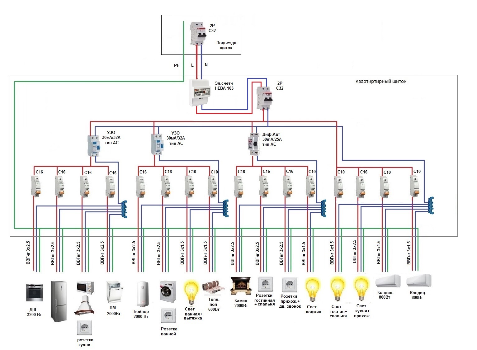 Здравствуйте, уважаемые форумчане! Планирую замену электропроводки в 2-х комнатной новостройке. Делать всё буду сам, в виду ограниченного бюджета (ипотека душит). От строителей остался квартирный щиток со счетчиком, 2-мя линиями розеток на дифавтоматах 25А/30мА и 2-мя линиями освещения на авт.16А. Почитав соответствующие темы форума, решил начертить свою схему эл.щита. Хотел бы узнать, рабочая ли схема? Может будут какие-нибудь замечания? Сразу скажу, что неотключаемых линий, аквасторож, УЗМ и других наворотов ставить не планирую. Из всего обилия быт. техники в наличии есть только стир.машина, холодильник и бойлер, всё остальное будет приобретаться со временем, поэтому заложенные потребляемые мощности приблизительны.