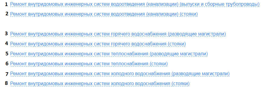 Подскажите, пожалуйста, у нас по плану капремонт, в нем 8 пунктов (см. картинку). Вопрос - что конкретно это означает? У меня дома совмещенный с/у, кран на кухне, батарея на кухне и в комнате. 1)Пункты 1-2 - правильно ли я понимаю, что это трубы, которые в туалете (он же ванная)? 2)Пункты 3,4,7,8 - то же самое, только еще трубы к крану на кухне. 3)А п.п.5,6 - это батареи?