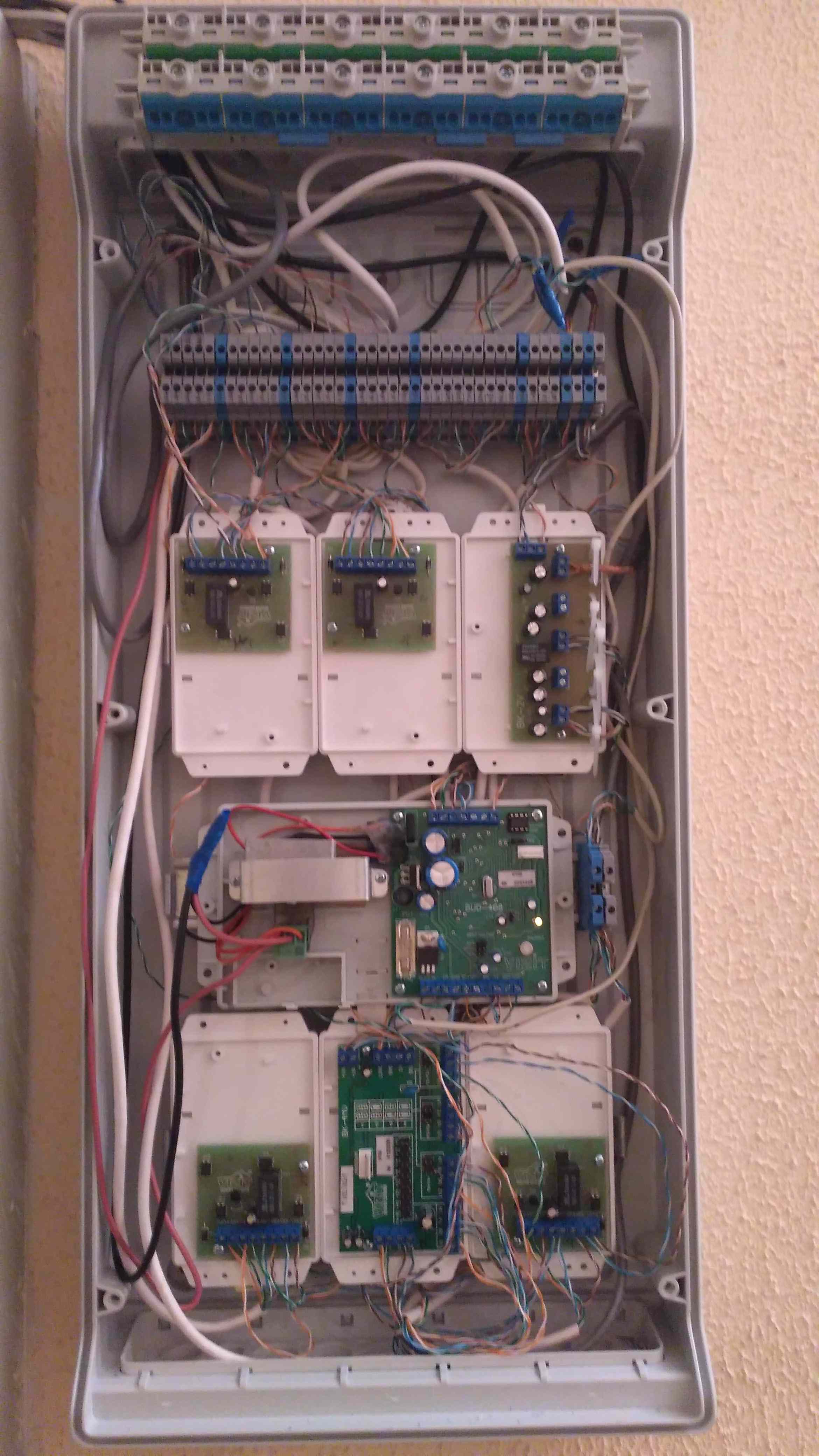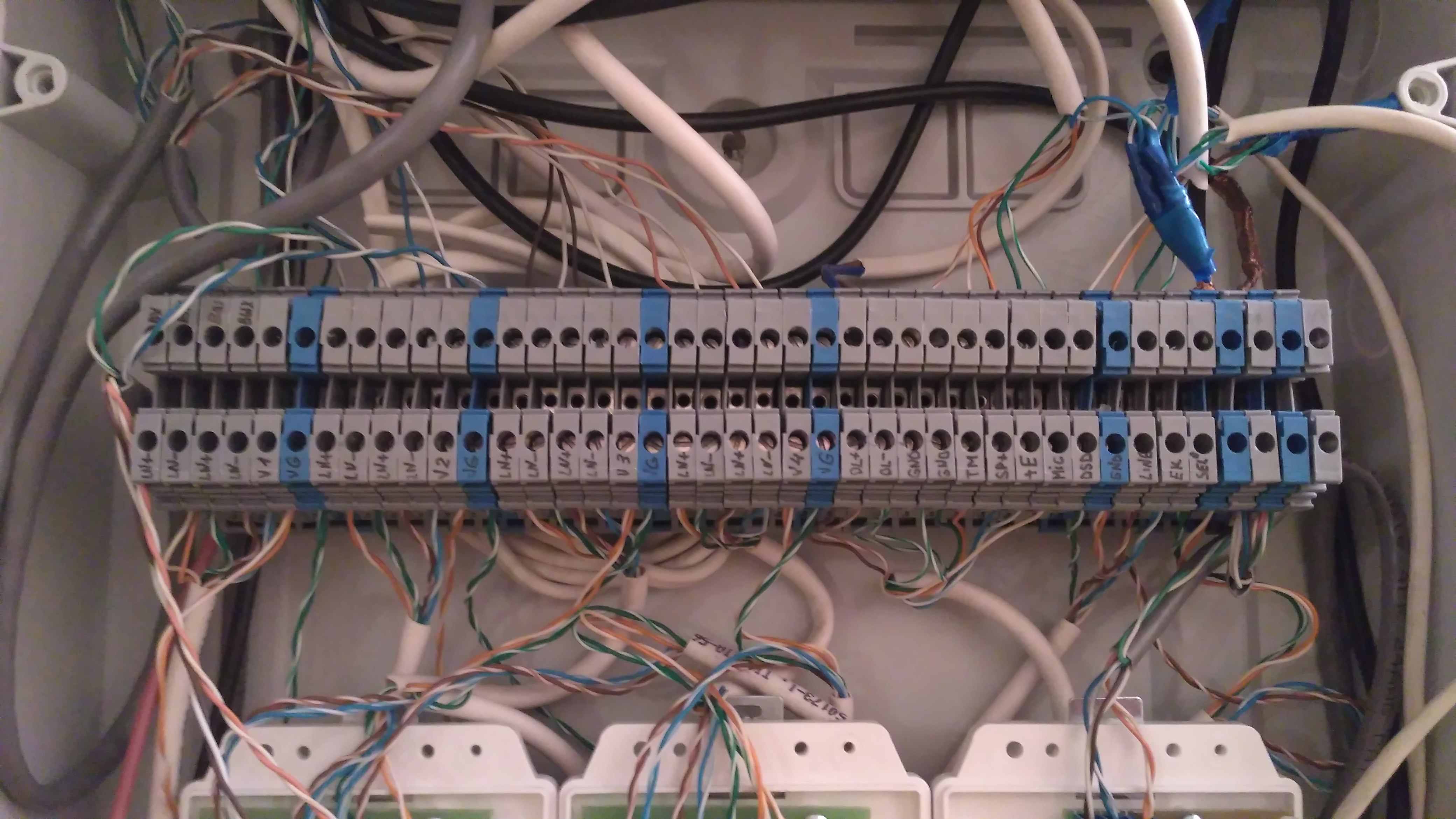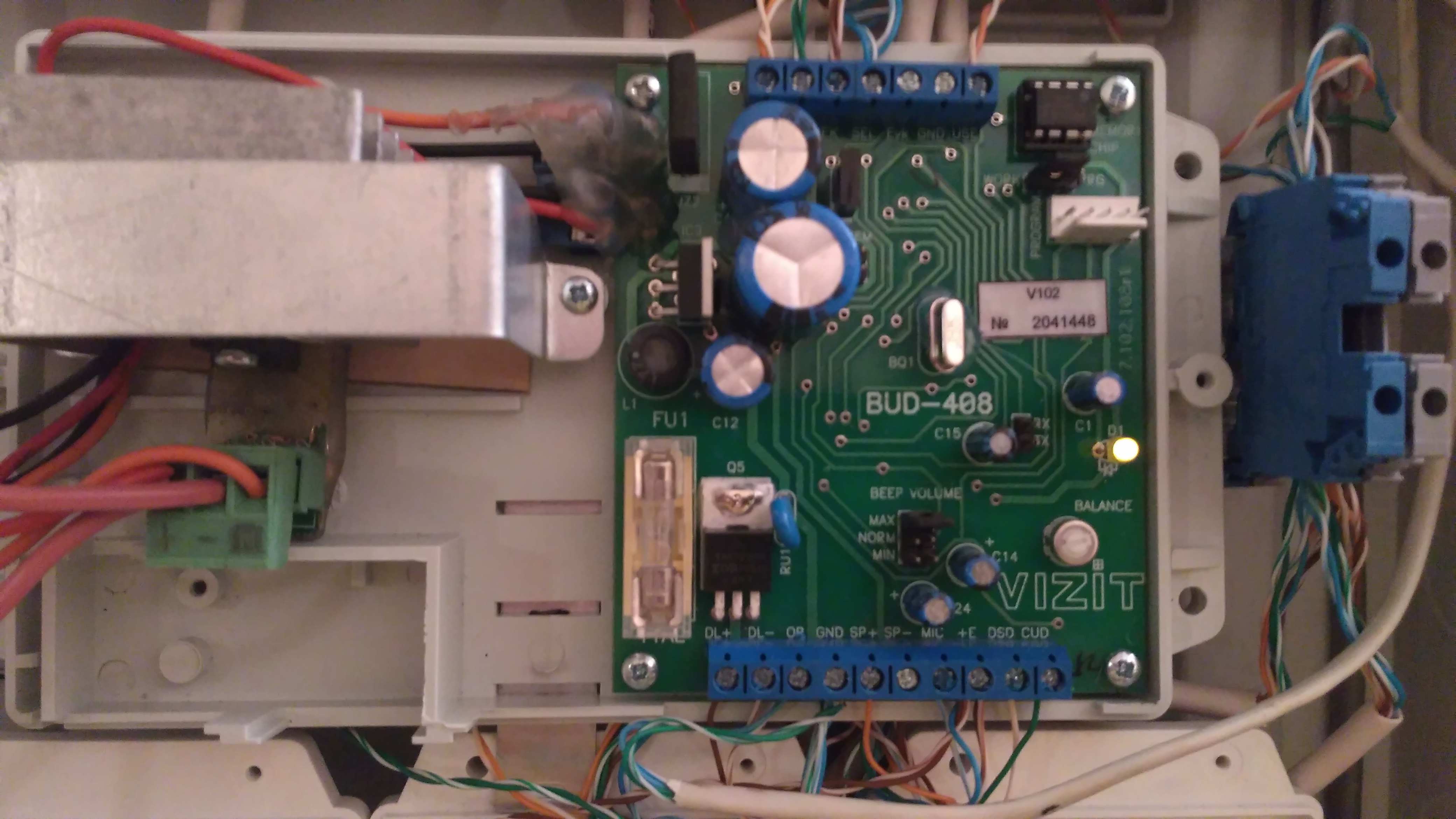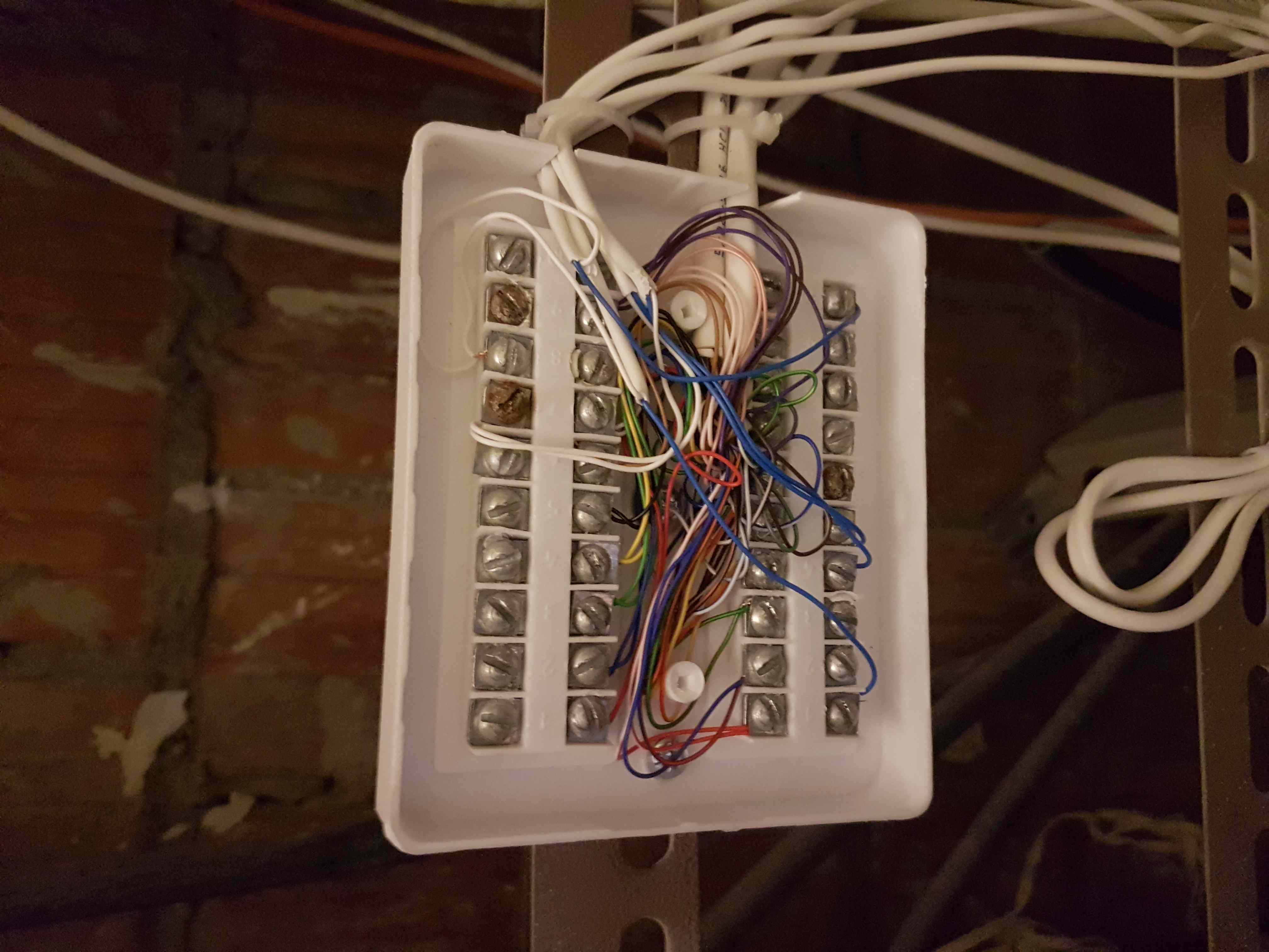 Хочу поставить видеодомофон. Вызывная панель в подъезде - см фото. В щитке на лестнице стоит коробка с клеммами, в нее заходит витая пара, после чего разводится на 4 лапши по 2 провода. К этим проводам и подключена трубка аудио домофона.