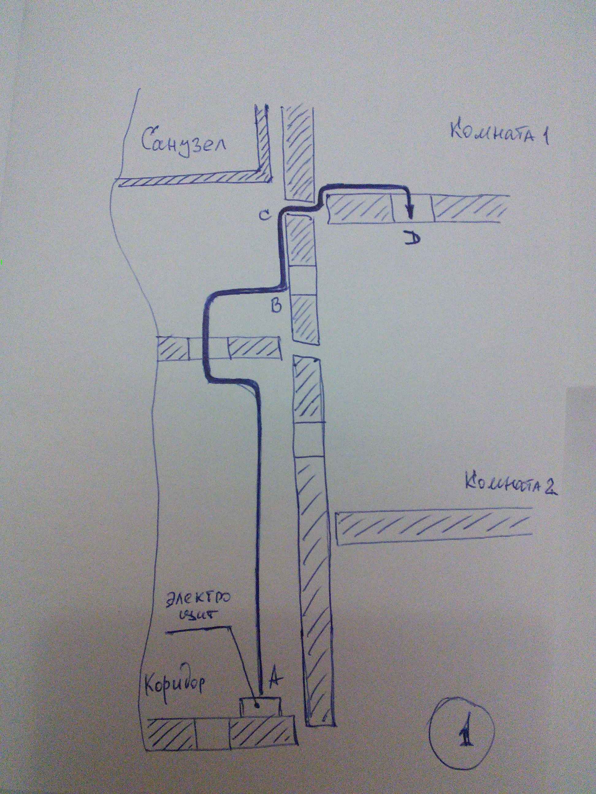 Допустим ли такой путь прокладки кабеля, как на картинке 1? (участок AB - по потолку, участок BC - в заводской штробе, участок CD - между панелей и далее в самодельной штробе.) Особенно интересует допустимость прокладки проводки между панелей (на участке CD).