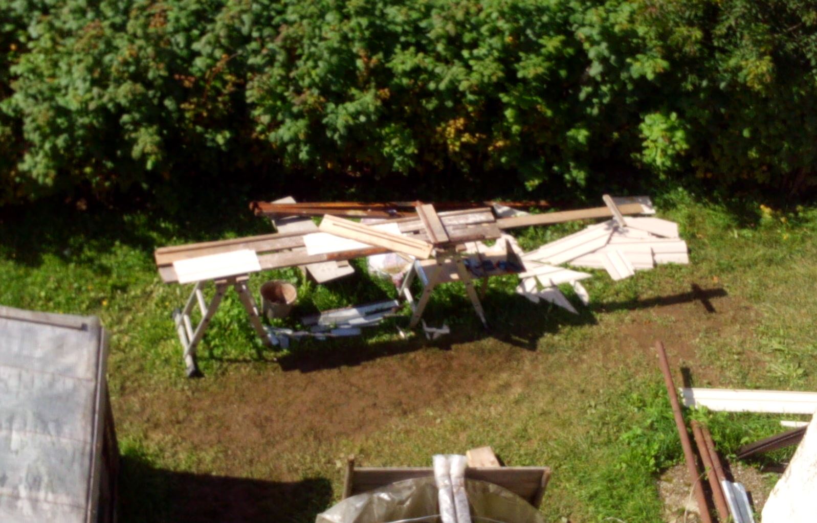 Но вот в положении стремянка мне не хватало столика для инструмента и дополнив п-образным профилем из жести один из кусков фанеры получил и мобильный быстросъемный столик.