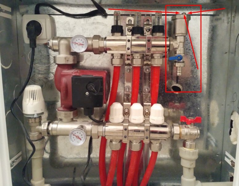 но такой узел без трехходового термостата ...... ? реально его установить?? и какая его цена?? Термостат воздушный в шкафу? вы про этот солдатик?? для развоздушивания который я выделил на фото?? P.S.: посмотрел в интернете, у меня получается термостат в левой нижней части коллектора