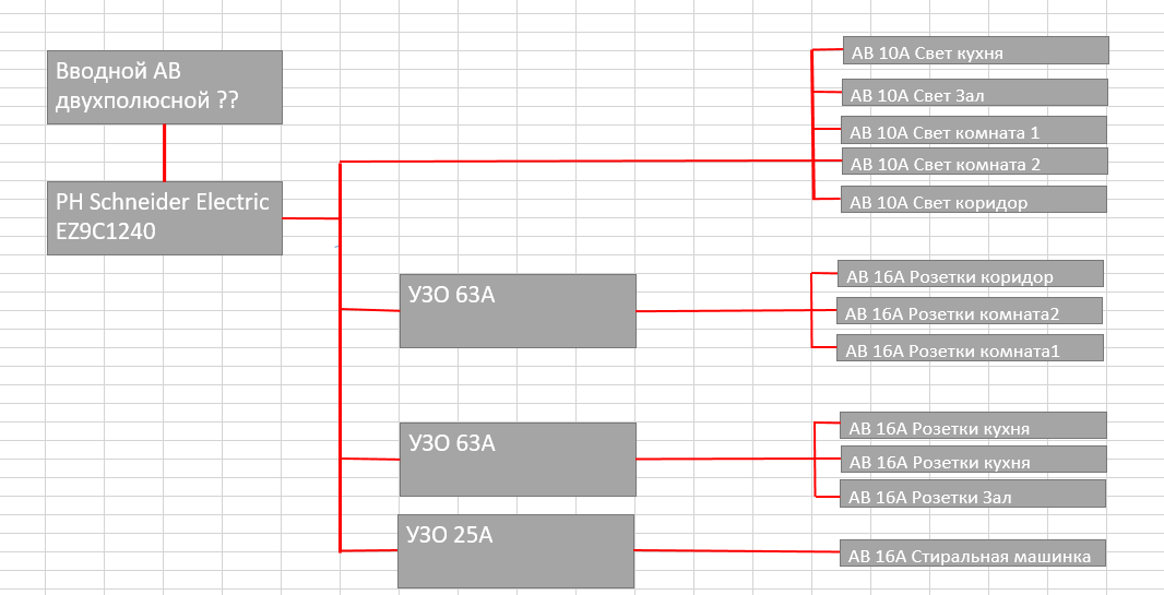 Надумал в скором времени делать ремонт, в связи с этим решил поменять проводку с алюминия на медь, накидал для себя небольшую схему щита в квартиру