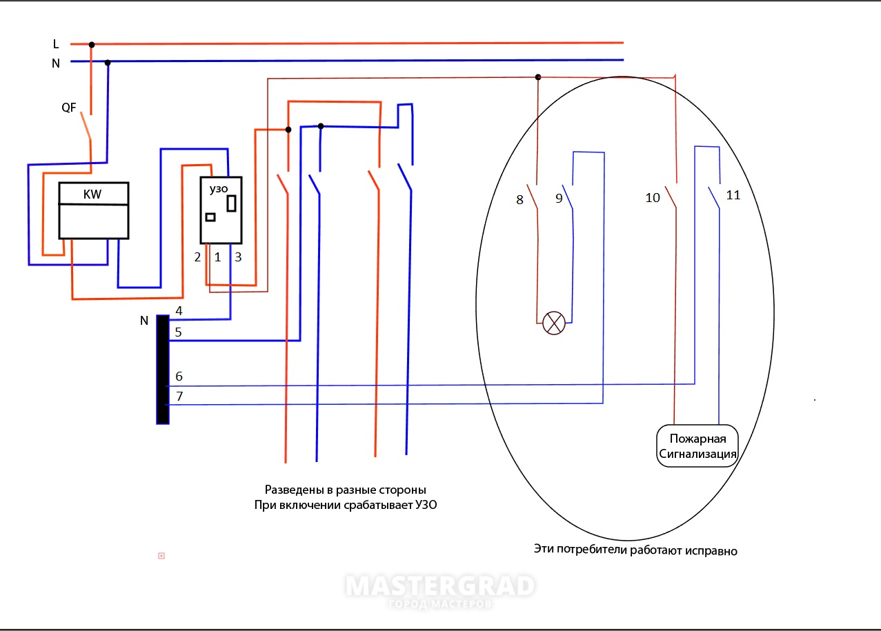 Схема нарисована лучше, чем собрана в щите.. Там как раз пересекаются нули вроде такого