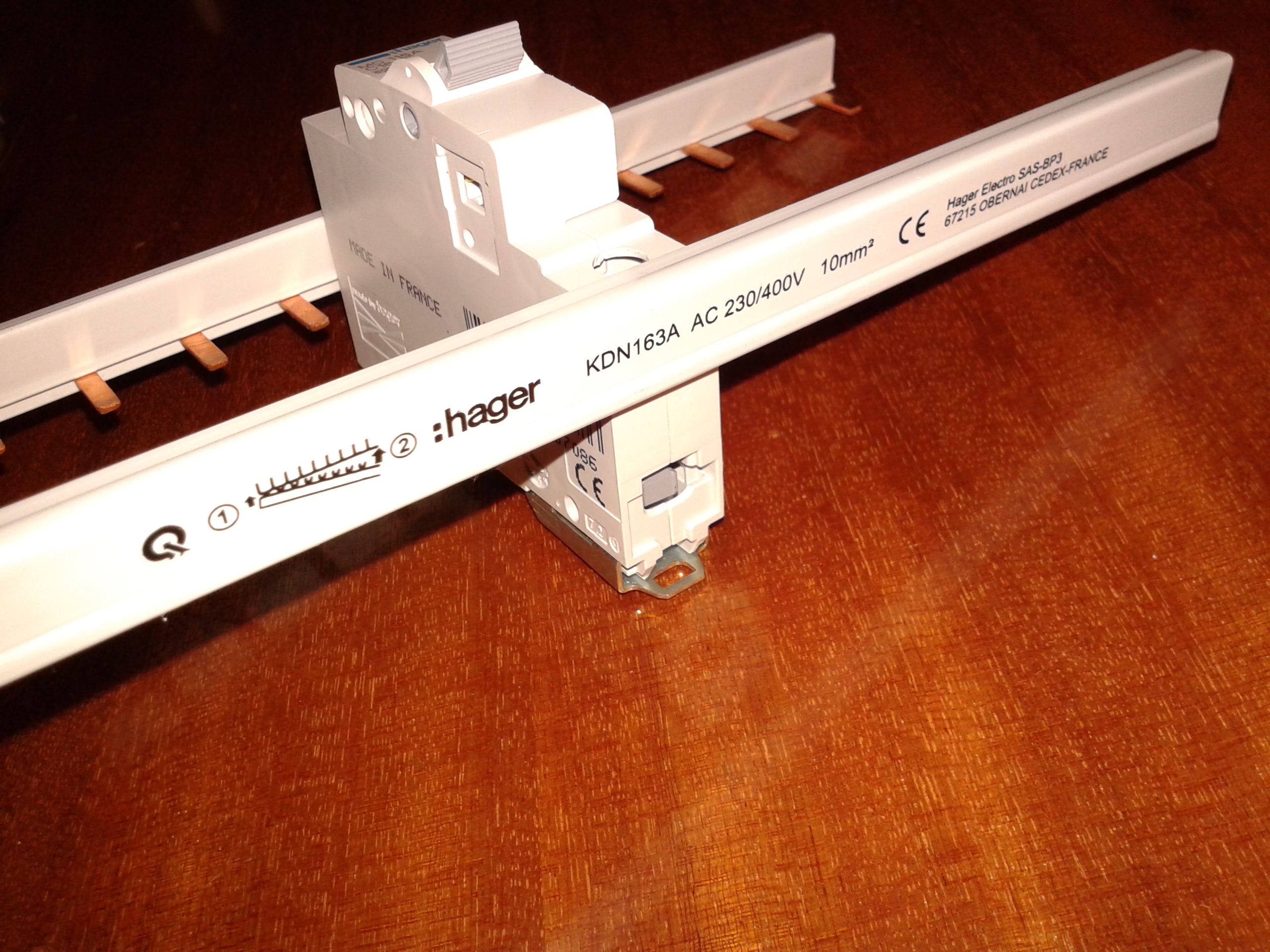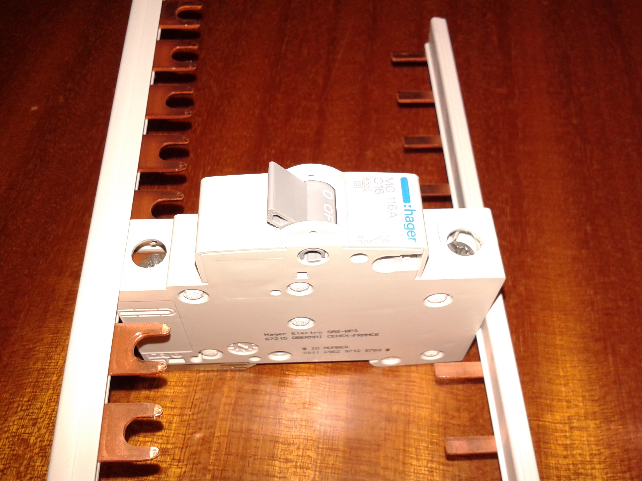 При покупке шины не забудьте, что для некоторых автоматов тип шины зависит от стороны подключения проводов. В данном конкретном случае удобней снизу. Шина в своём гнезде, провод в своём. Правда, на постсоветском пространстве принято подавать питание сверху.
