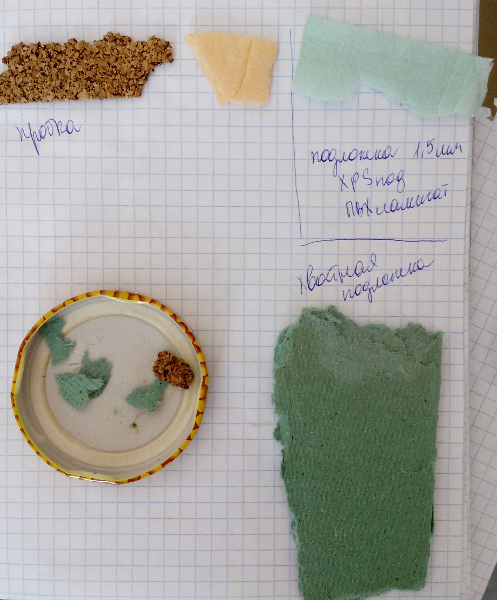 Подготовка: 1) осмотрен ассортимент Леруа Мерлен, я оторвала кусочки разных материалов, больше всего интересует пробковая подложка 2мм и хвойная подложка 3мм. Так вот: кусочек пробковой подложки и кусочек хвойной подложки я поместила в небольшое количество воды (см. фото), за ночь вода высохла, результат: пробка осталась цельной (несколько пробковых крошек покоробилось и все), а вот хвойная подложка "разлезлась" / распалась. У меня вопрос, если что-то прольется на ламинат и я не успею быстро вытереть - под ламинатом такое же произойдет? |Хотя на сайте-производителе хвойной подложки написано "способность намокать и высыхать без потери свойств"