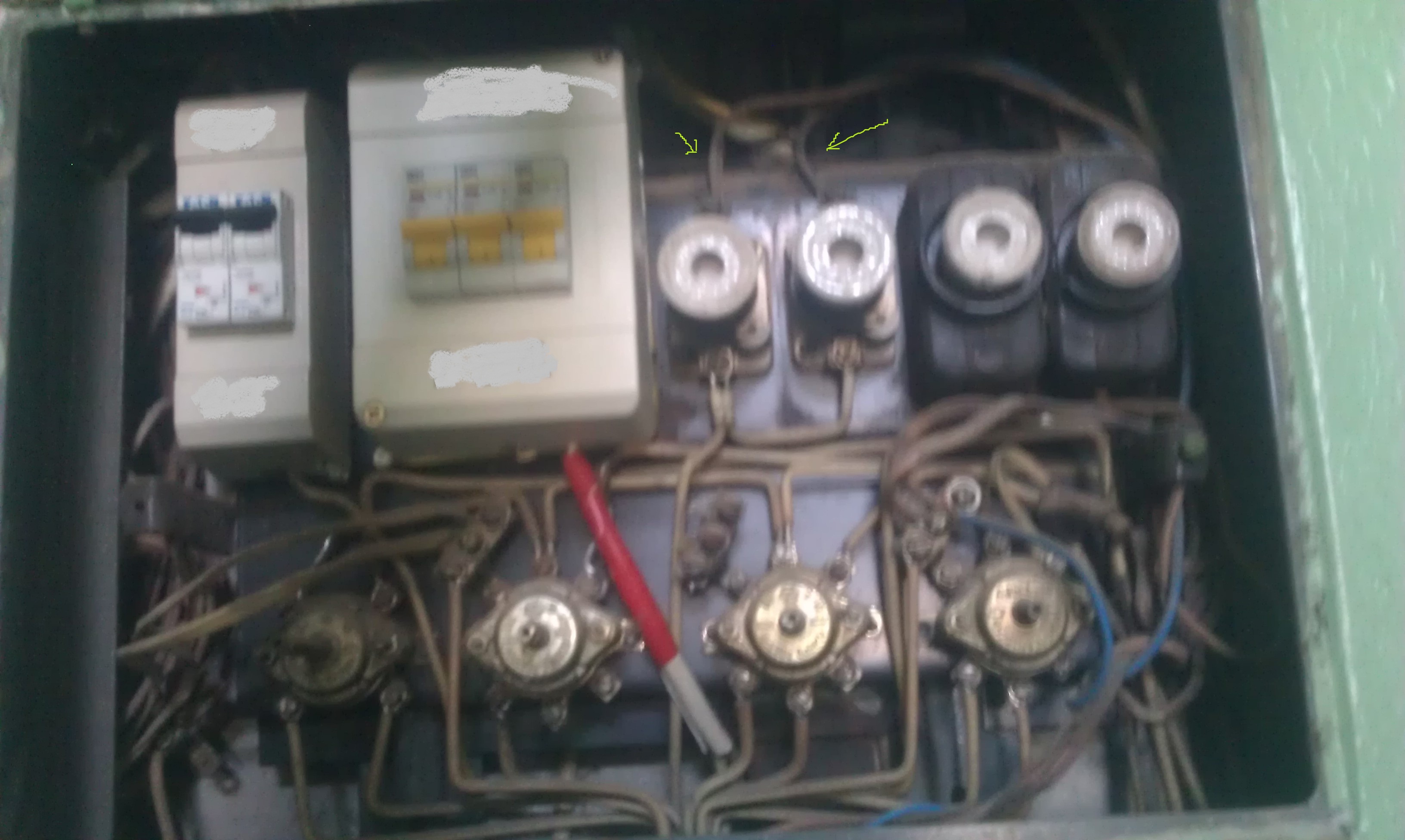 Куда крутить кабель к фазе понятно (указанно зелеными стрелками и там можно не отключать напряжение, вынув пробку). В щитке уже отгорал ноль после к/з. Похоже, что он был на клемме пакетника под пробками. Теперь где искать два нужных нулевых провода? Открывать щиток и по кабелю смотреть куда тянется 4-й вывод нуля со счетчика? Тыкать индикаторной отверткой в контакты этого пакетника опасно (может ли коротнуть)? И для установки автоматов обесточить такой щиток можно только рубильником в подвале?