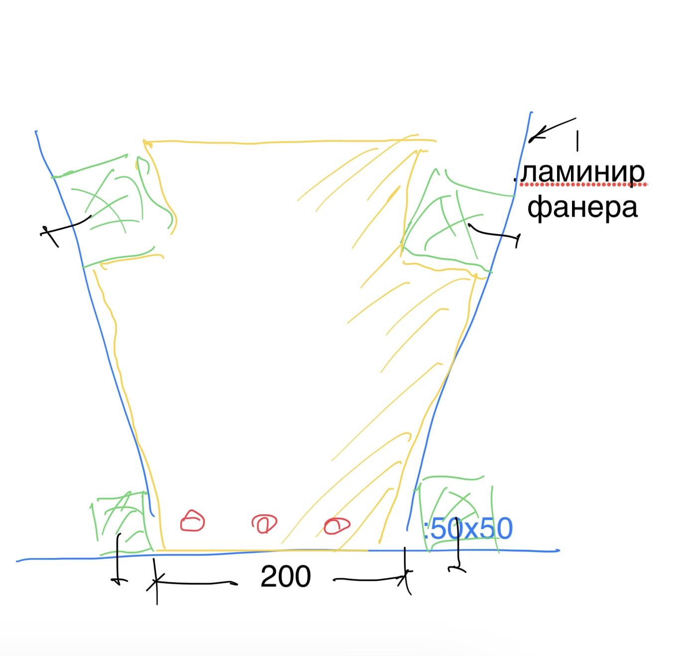 BV, На предыдущем эскизе я обозначила шурупы - что бы было понятно как и в какой последовательности я собираюсь снимать опалубки. Если бруски окажутся снаружи - то открутить шурупы не получится. Ах, саморезы, пардон муа.