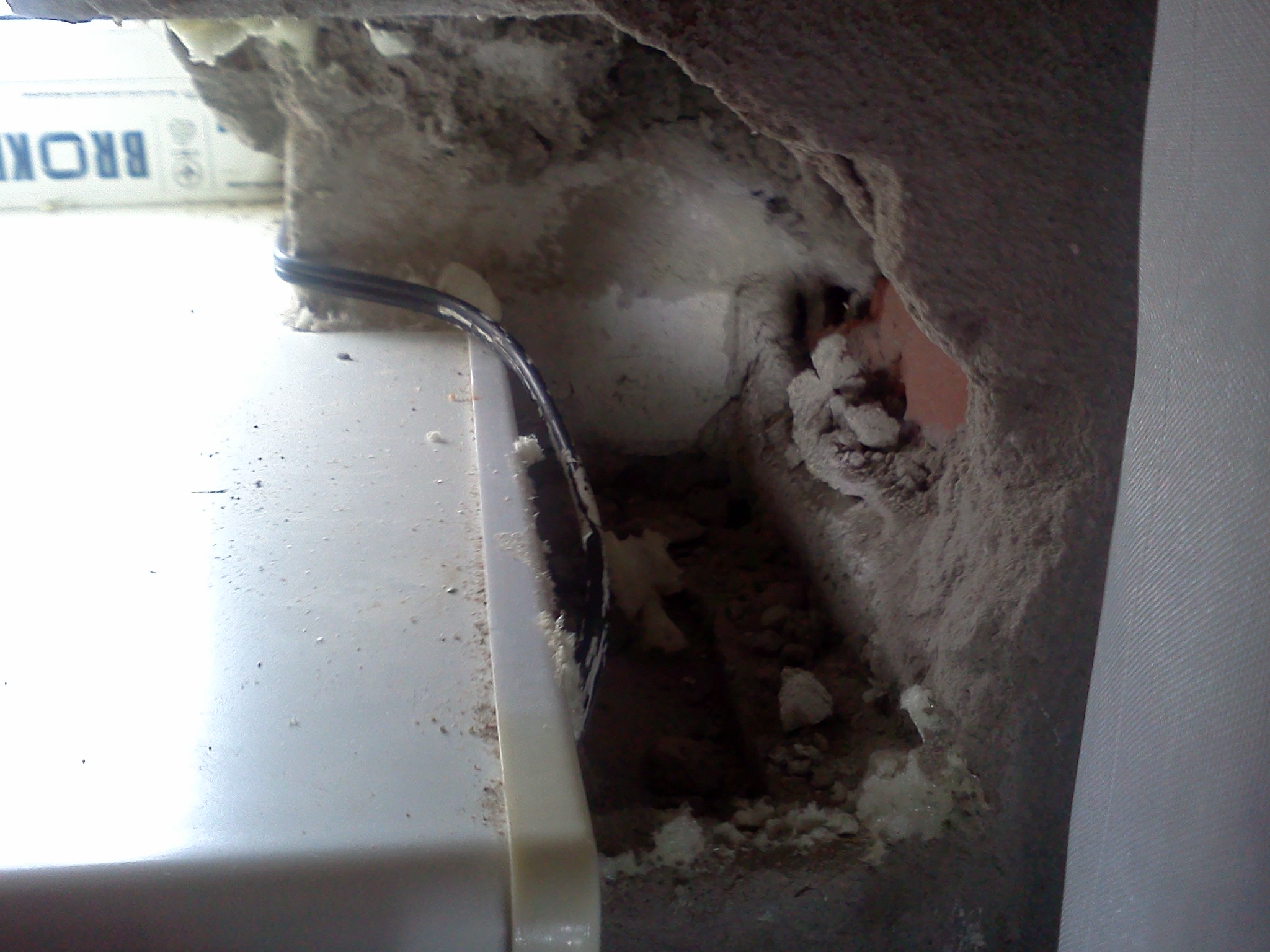 А что это за неуставной кабель справа? Такое впечатление, что зазор между окном и стеной в этом месте миллиметров пять. Это непорядок. Да и вообще швы едва ли на нижнем допустимом пределе по ширине. Установка на анкерные пластины. Это само по себе и не косяк, но зачем они в кирпиче? Закреплены одним(sic!) дюбель-гвоздём (любимый крепёж по бетону всех халтурщиков).