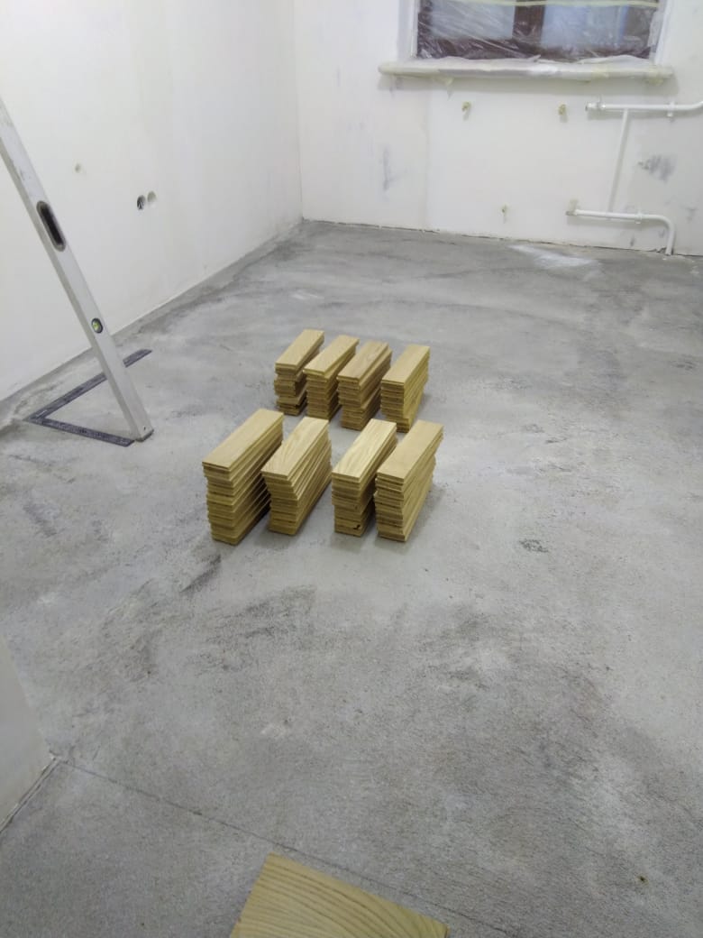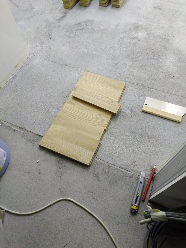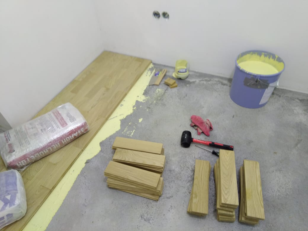 Далее просто спокойно на клей клею плашки "вразбежку" сплачиваю их резиновой киянкой и прижимаю сверху каким-нибудь грузом.. что под руку попалось. Мешки смесей например, обернул в стретч-ленту, чтобы с них не сыпался цемент.