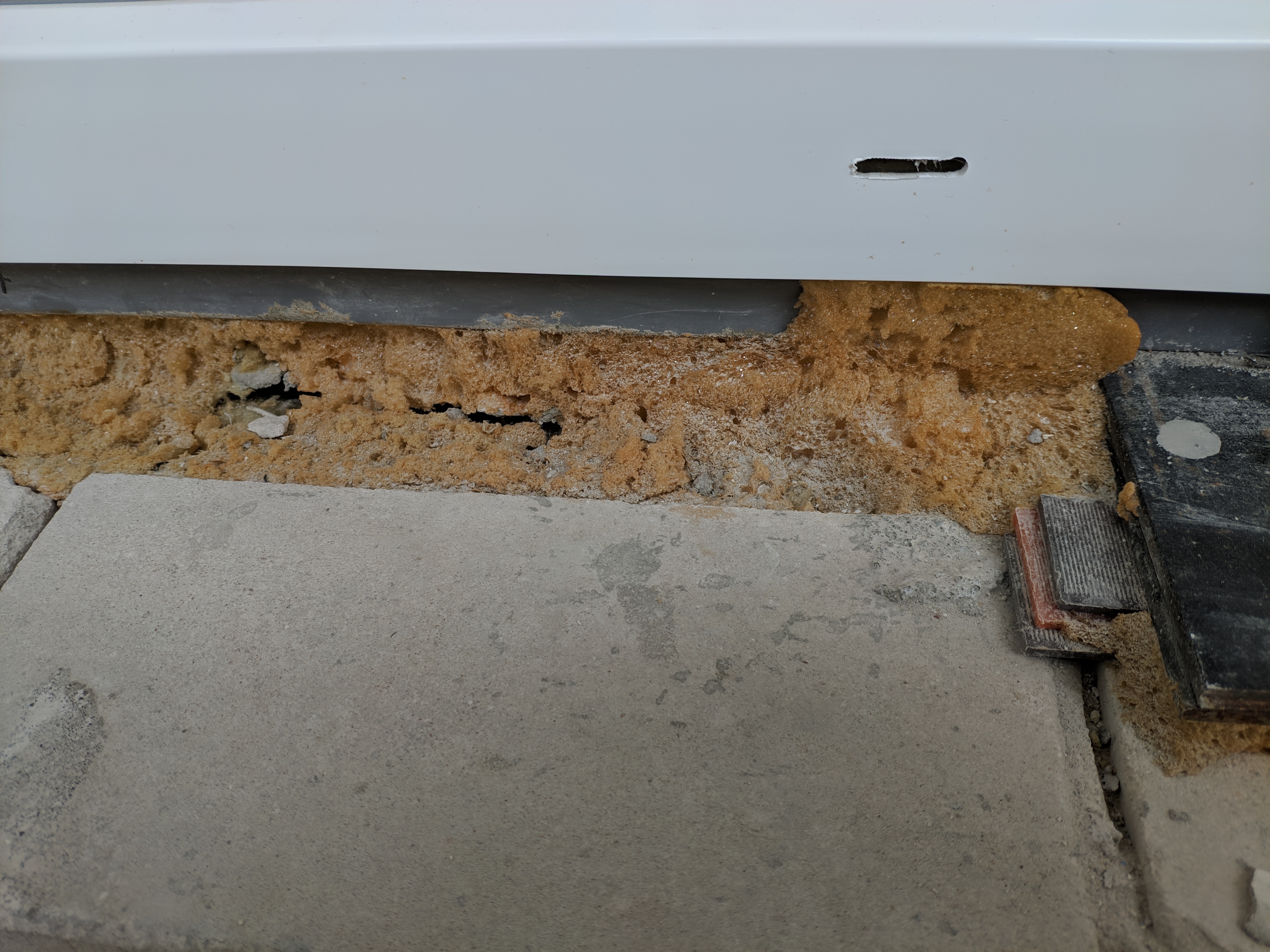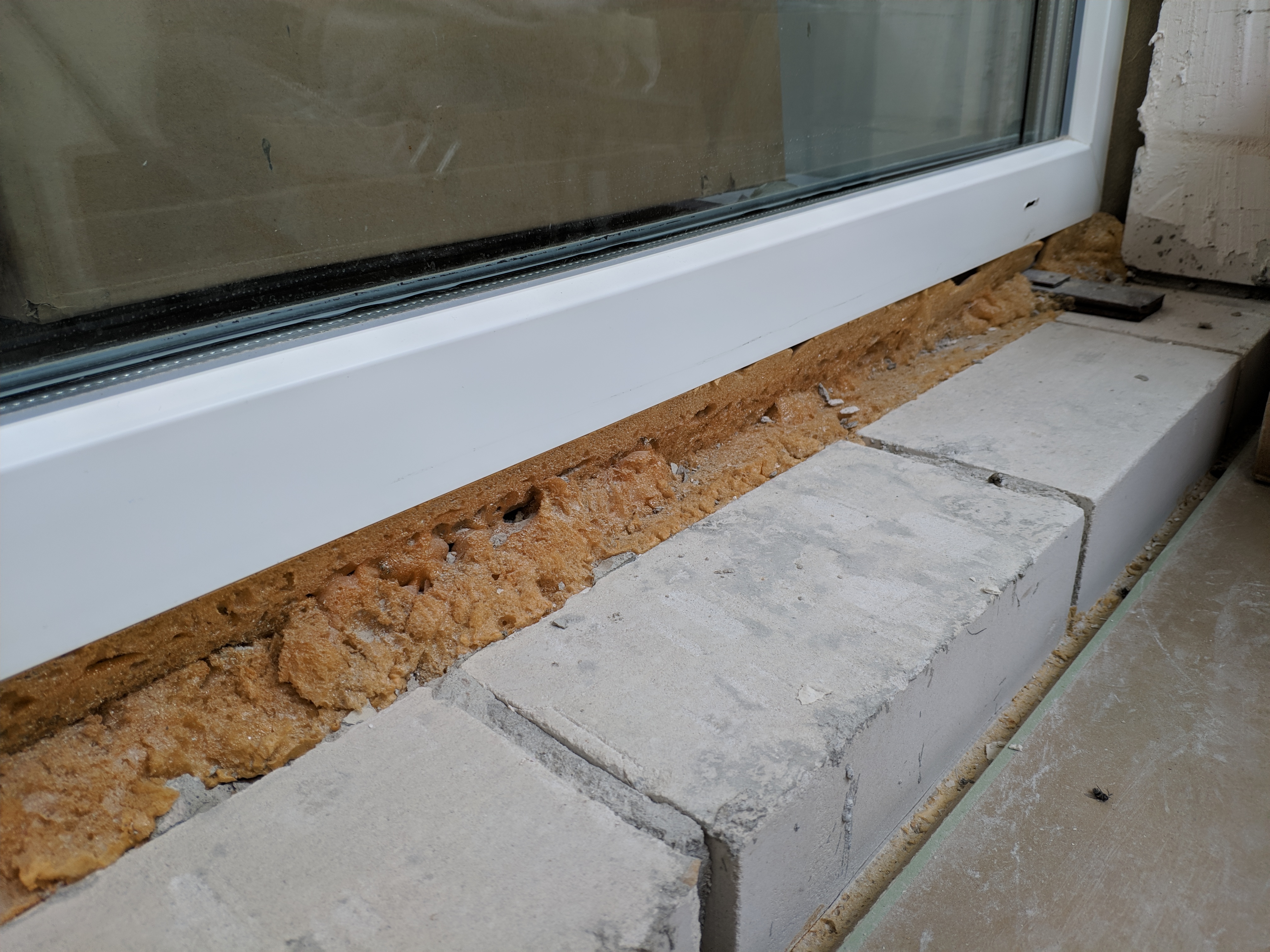 Здравствуйте. У меня между комнатой и остеклённой лоджией установлено застройщиком французское окно. В процессе ремонта со стороны комнаты были сделаны откосы, а внизу керамогранитная ступень. Лоджия будет ремонтироваться в следующем году. Внизу окна планируется такая же ступень. Пока же ничего нет. Монтажный шов внизу окна ничем не закрыт, подрезан рабочими, что тоже вроде не рекомендуется, и от солнца выгорел. Окно стоит на пластинах в зоне утеплителя.