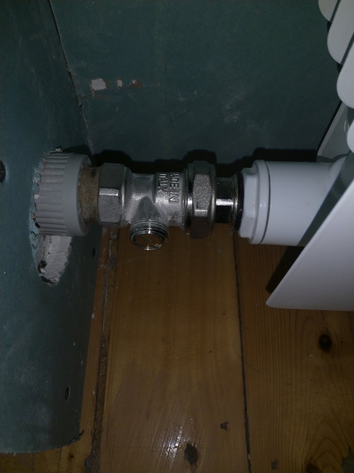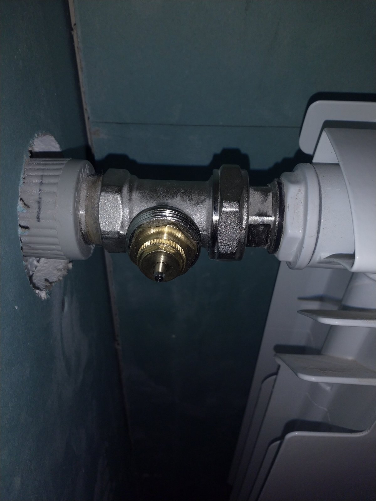 Перед самой батареей установлен терморегулятор и запорный кран (термостатический комплект 3/4 "ICMA"). Терморегулятор сейчас снят, клапан полностью открыт. Воздух стравлен.