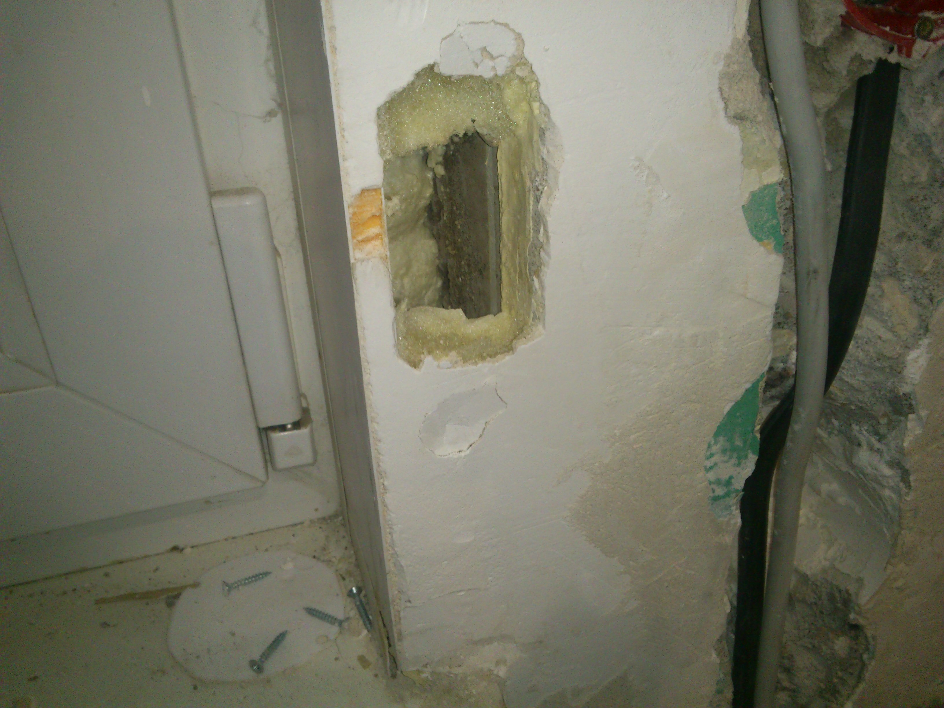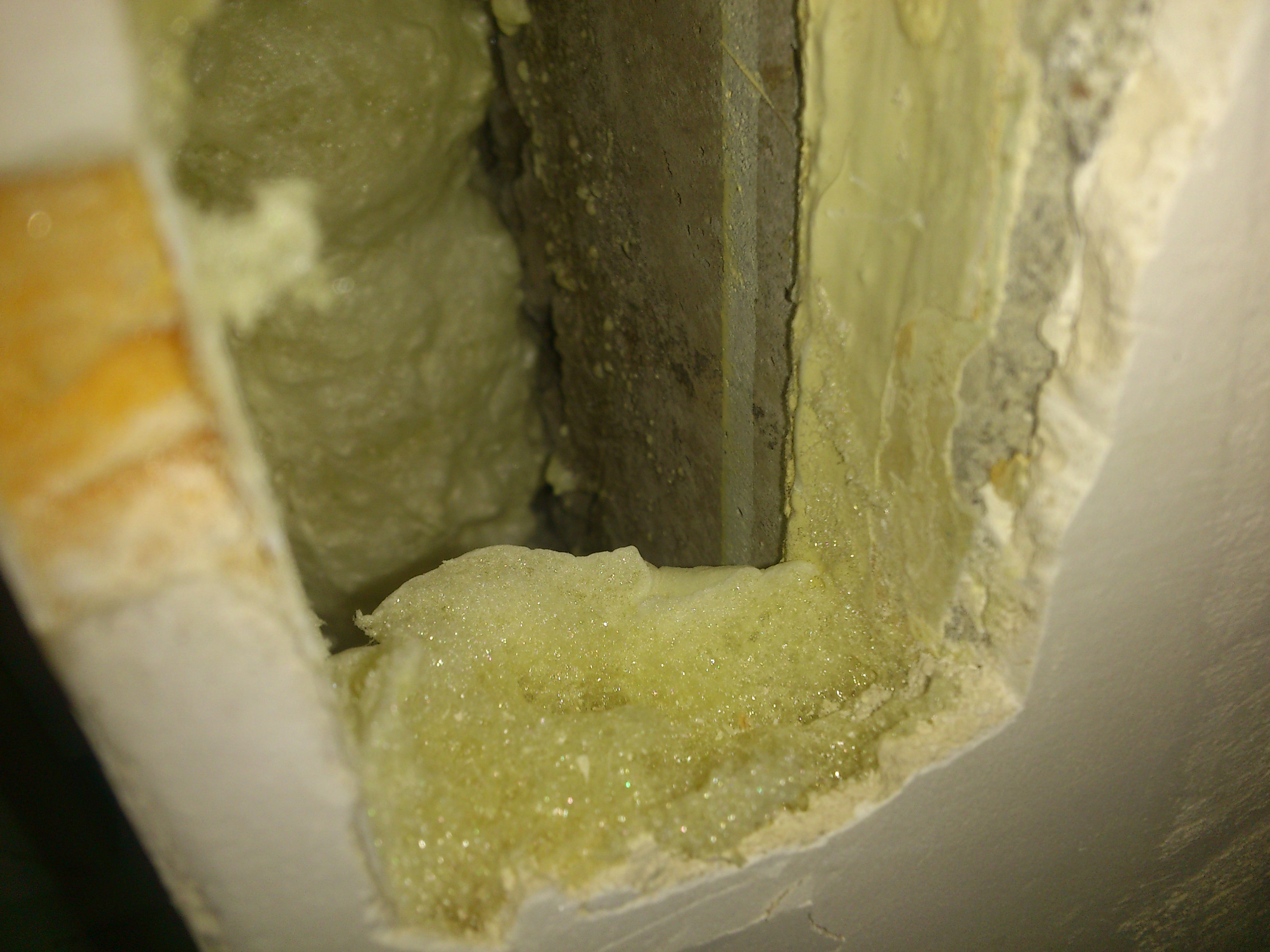 Недавно я случайно нажал пальцем на край стены около откоса и небольшим усилием продавил дыру. Расковырял чуток и там вот такая картина: